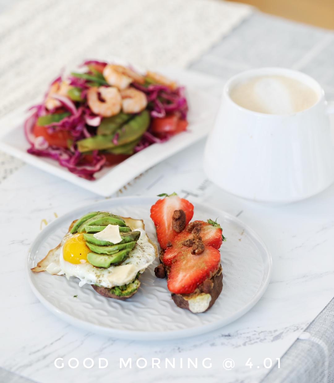 红薯开放三明治:一甜一咸,沙拉、拿铁咖啡。4月开始了,大家请继续加油呀!