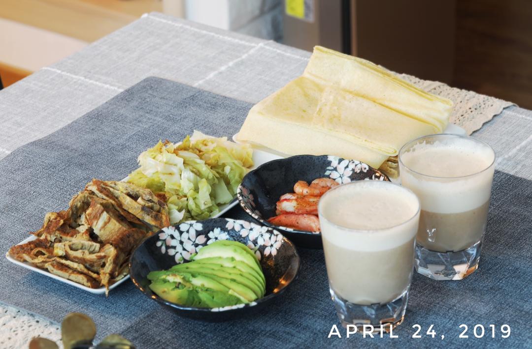 山东杂粮煎饼,黄豆酱煎蛋饼,烤圆白菜丝,牛油果,虾仁和蟹柳,加了奶茶味蛋白粉的豆浆。#嗯,...