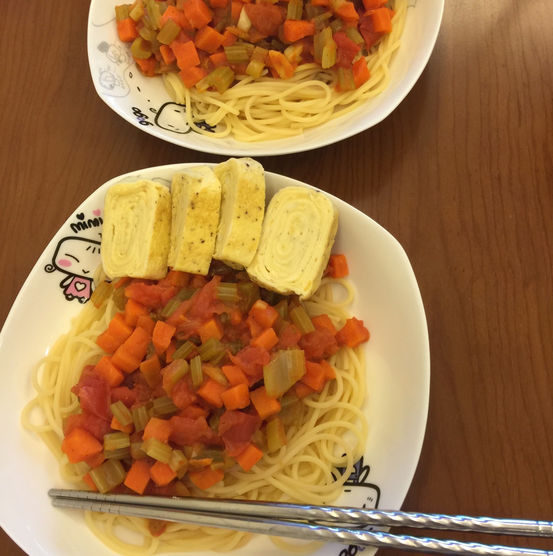 #餐LU# 简单的拌面,萝卜芹菜西红柿炒了下拌意大利面,老样子6个蛋的厚蛋烧(2整蛋4蛋清) #晚餐•2015年5月21...