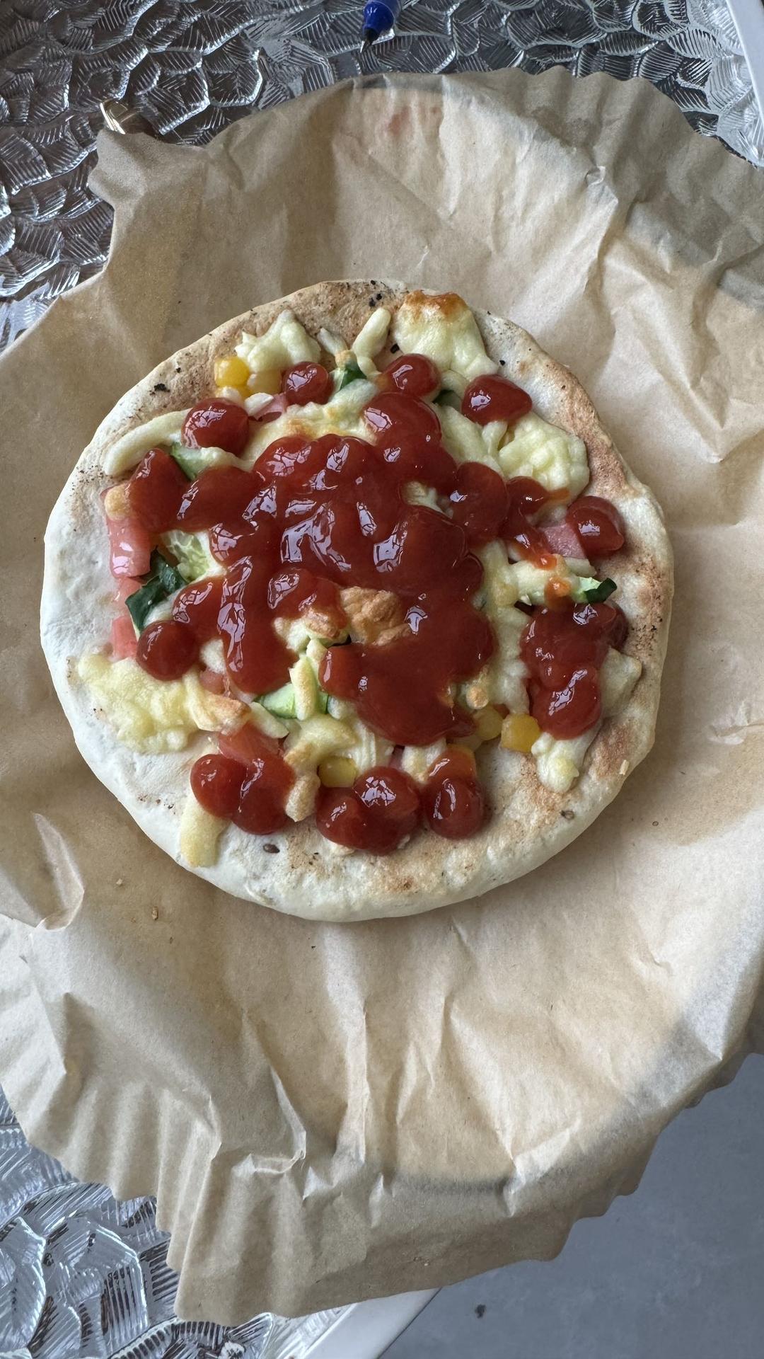 烧饼做的披萨 撒上想吃的配菜 芝士 空气炸锅180度 7分钟 出锅淋上番茄酱