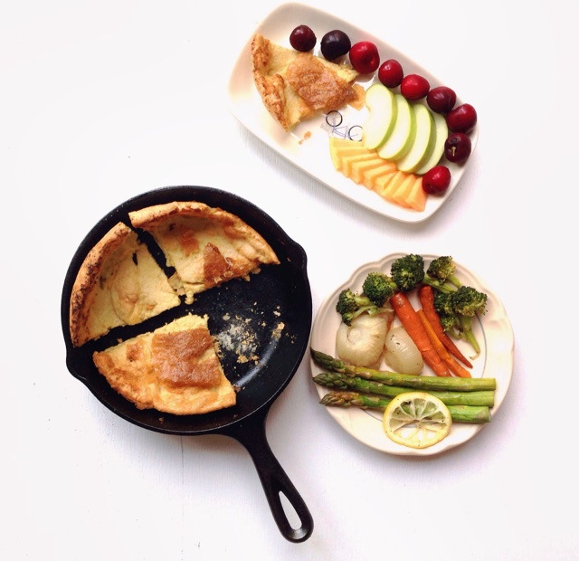 四分之一片荷兰宝贝,烤蔬菜,水果。室友还给了个栗子五谷小粽子,好吃呢!