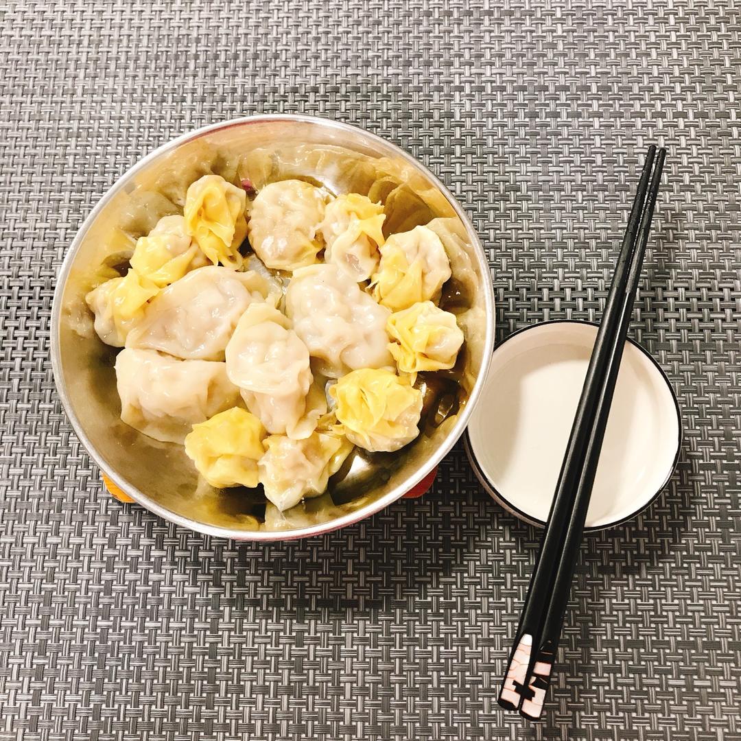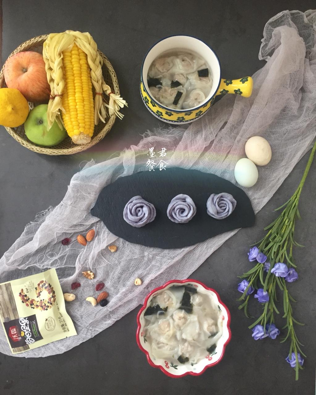 今日:干贝猪肉馅馄饨、蓝色玫瑰馒头、混合坚果、玉米、鸡蛋~