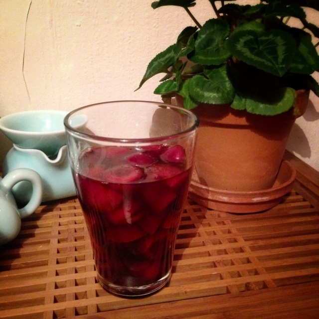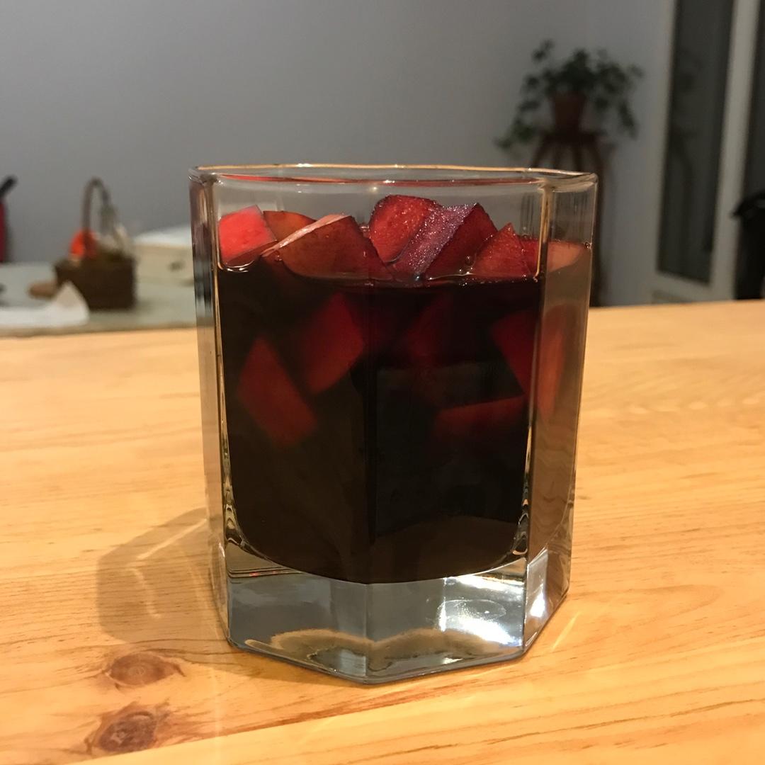 小半瓶红酒,两个桃子去皮切块,一把樱桃去核切半,几大勺糖,冰箱里泡...