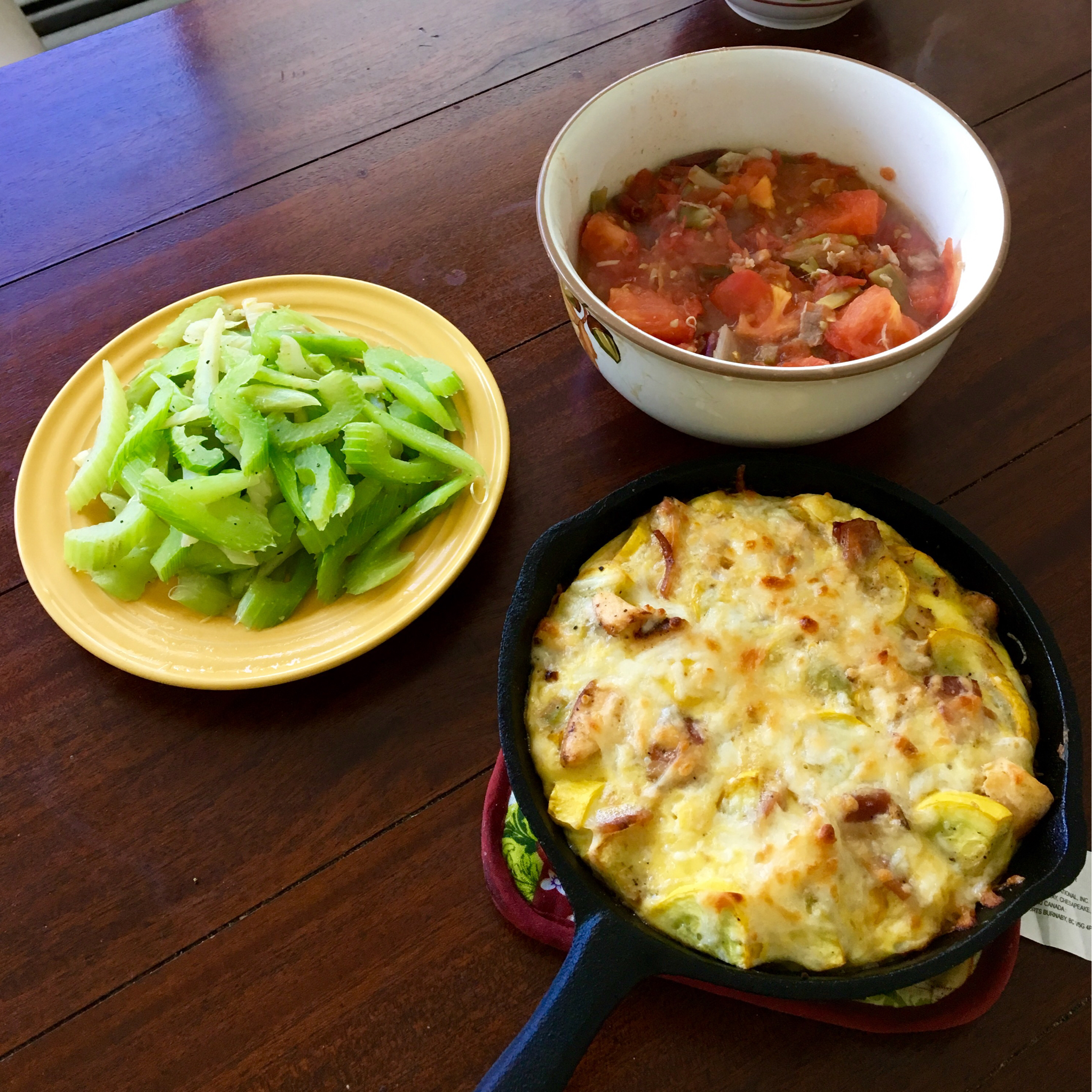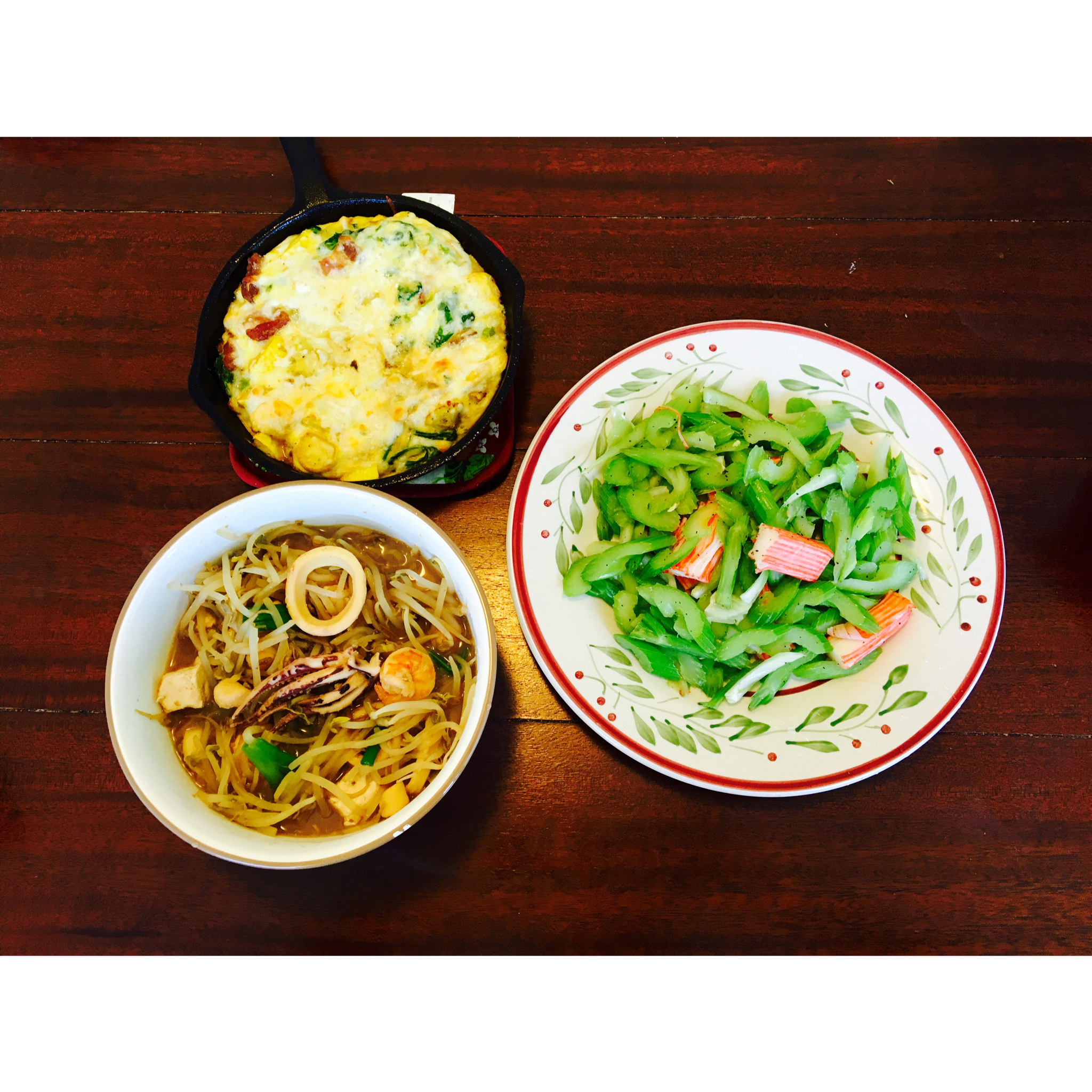 番茄肥牛,三文鱼yellow squash frittata,炒芹菜