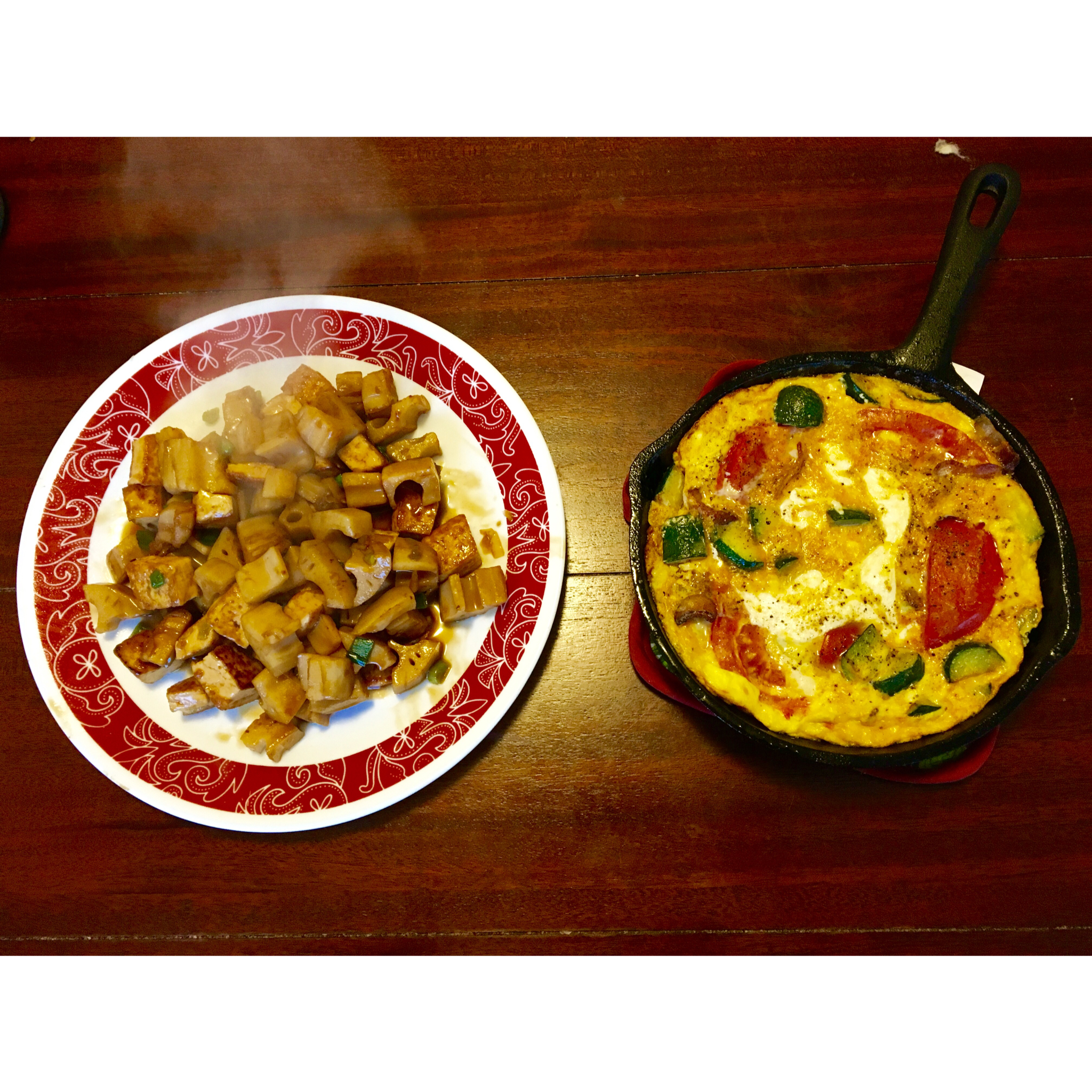 豆腐炒藕丁,番茄西红柿培根frittata