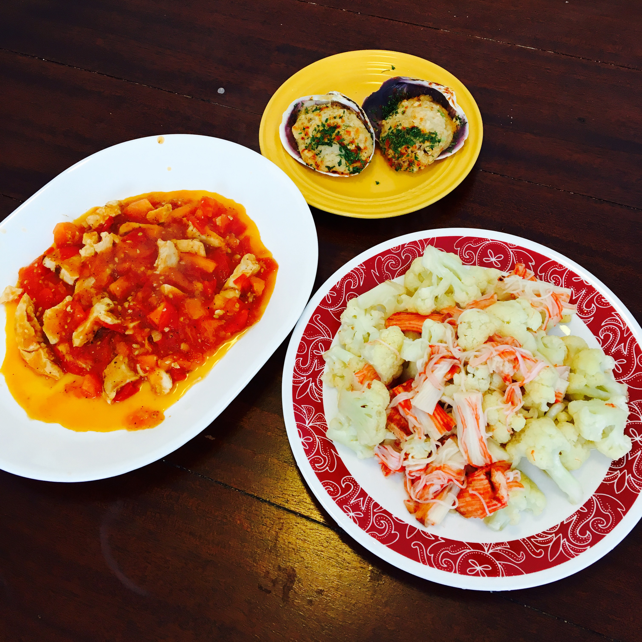 番茄鸡胸,蟹棒炒花菜,两只clam