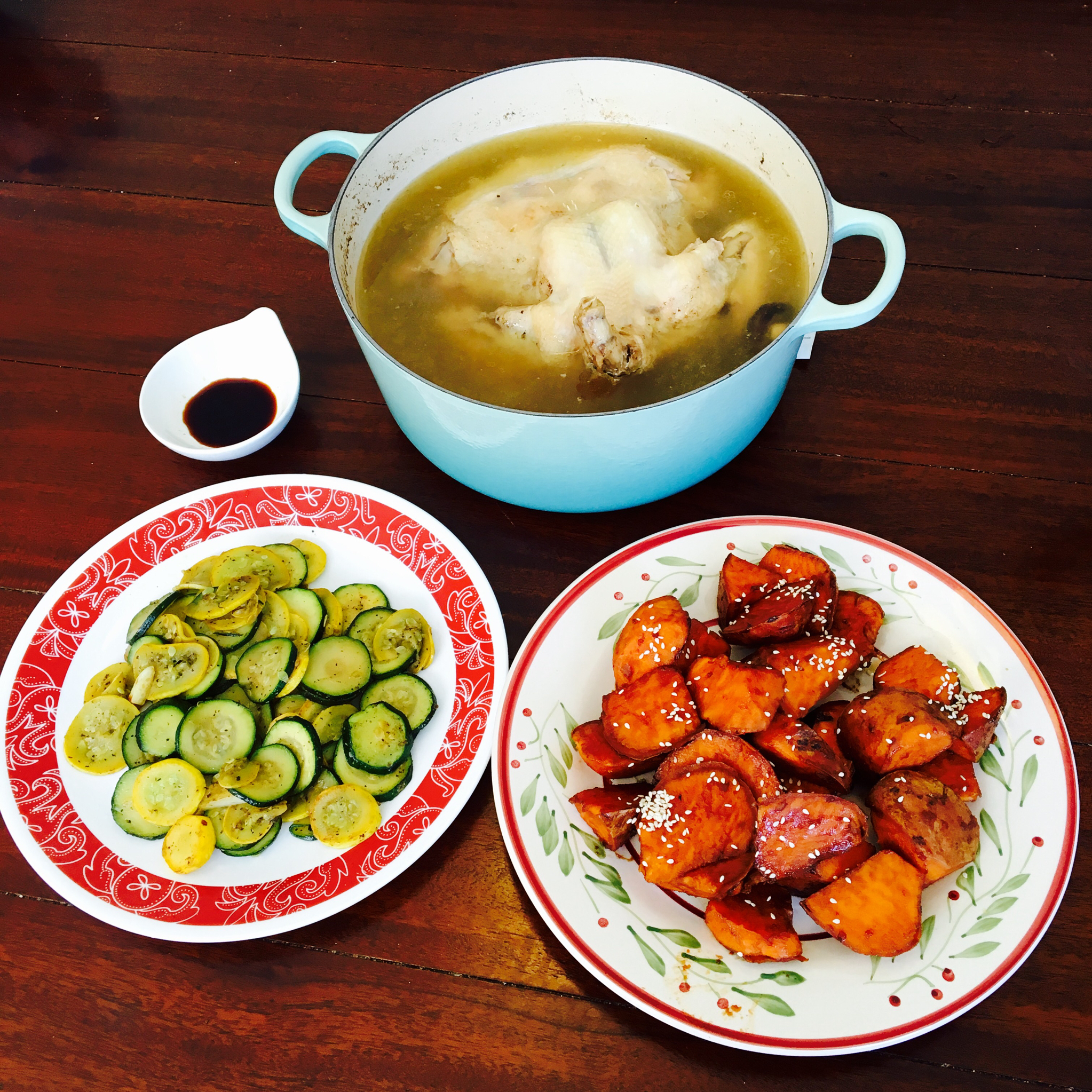 香菇炖鸡汤,焦糖红薯,zucchini炒yellow squash