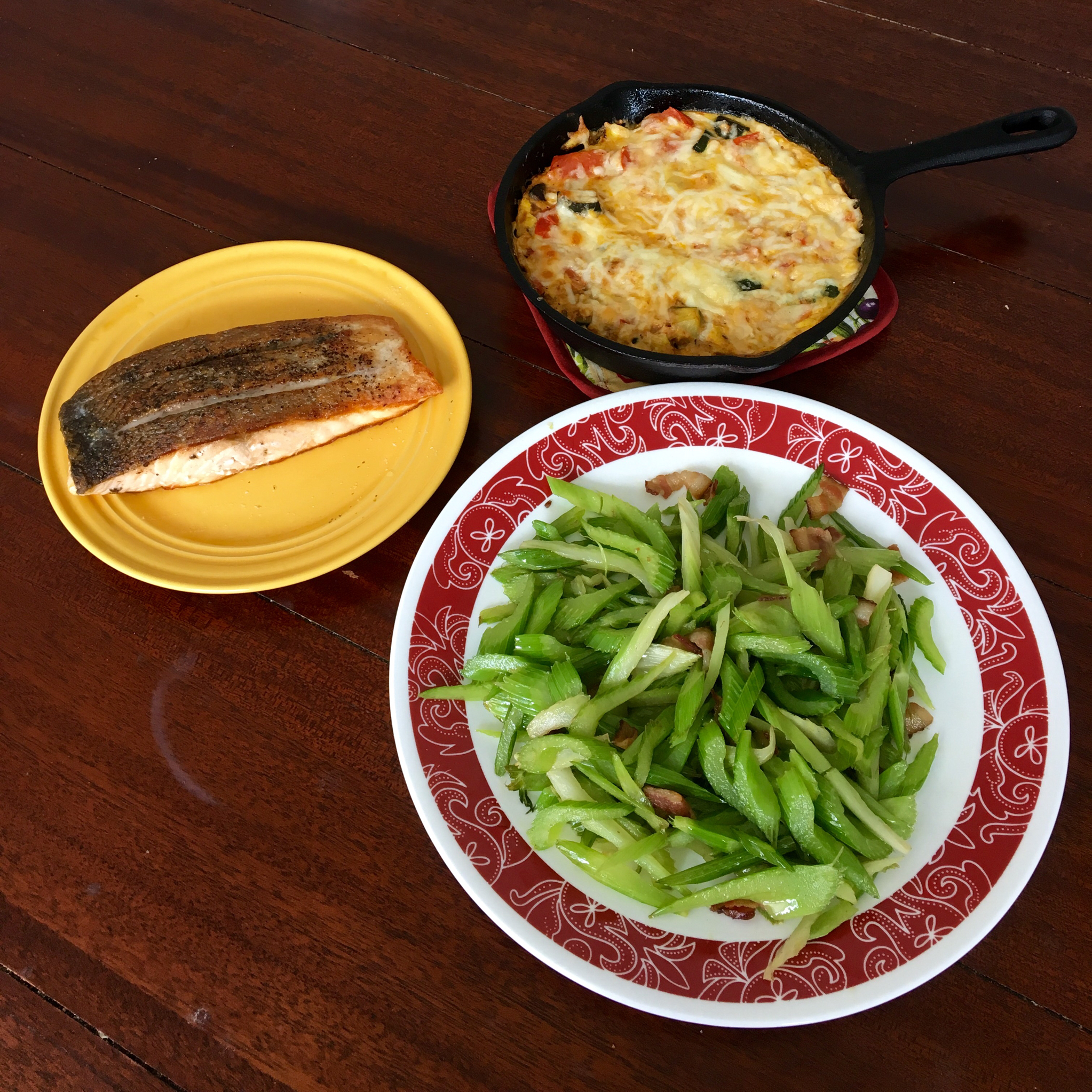 煎三文鱼,番茄zucchini frittata,培根炒芹菜