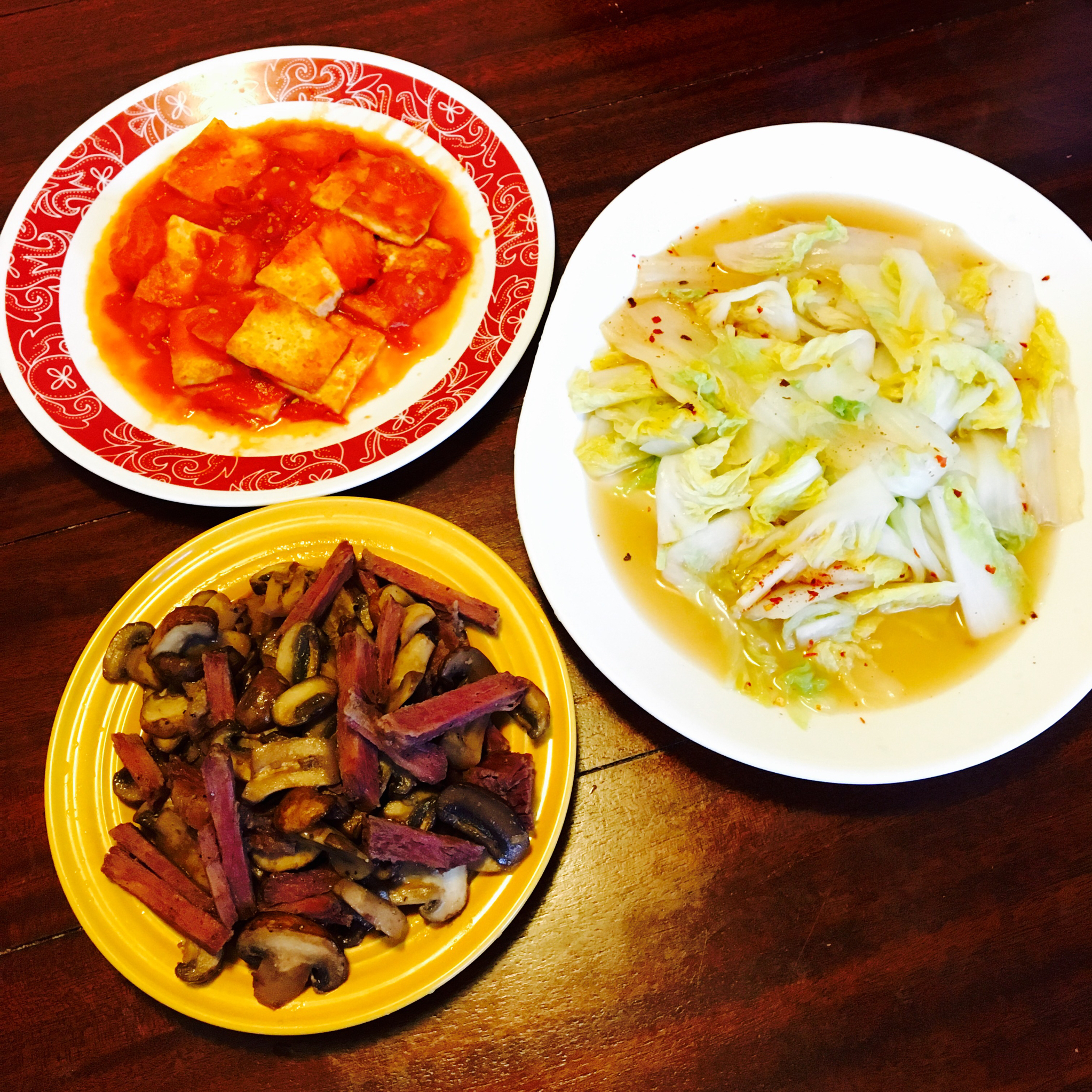蘑菇炒牛肉,番茄豆腐,辣白菜