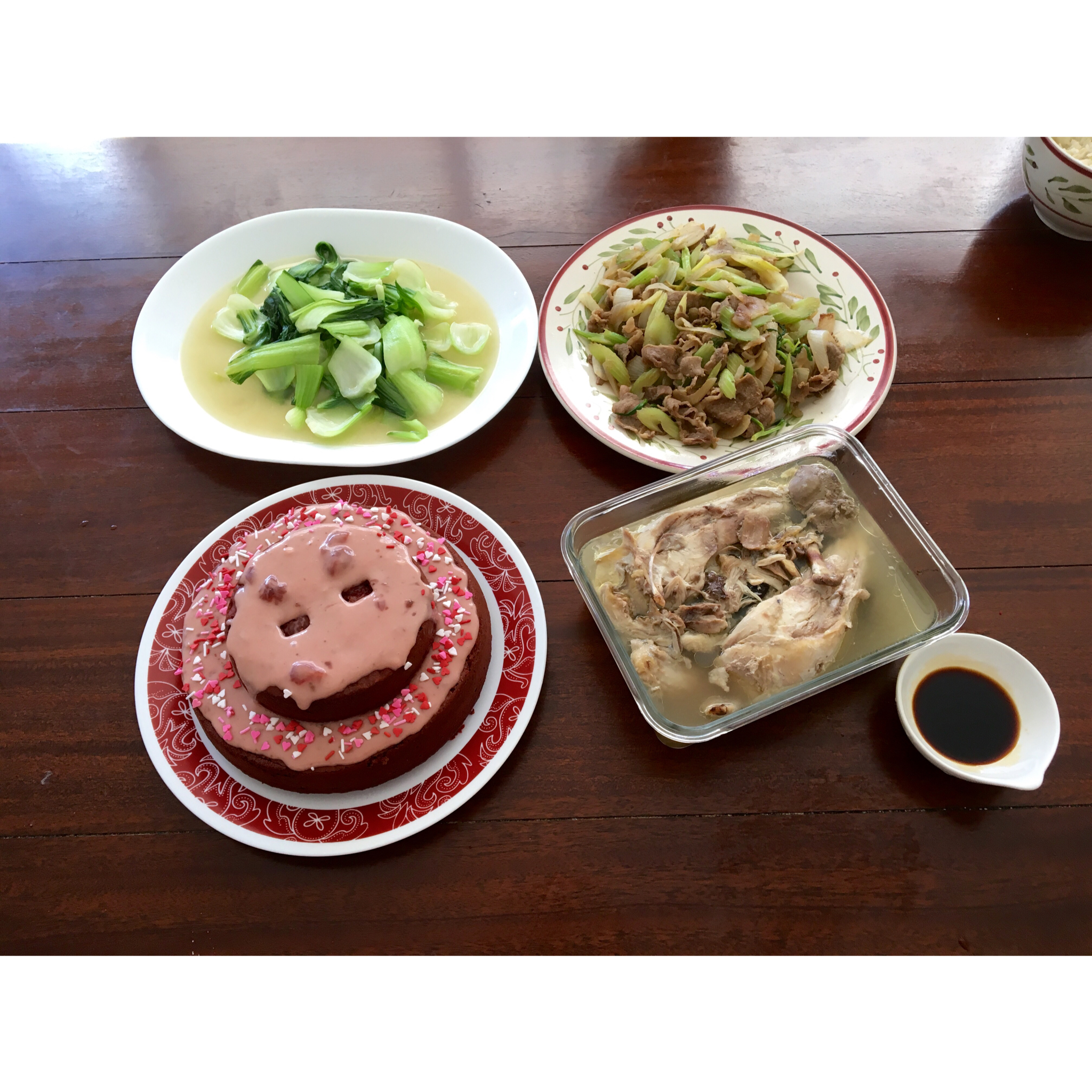 简单的生日餐~ 鸡汤,鸡汤烧青菜,芹菜炒肥牛,加生日蛋糕