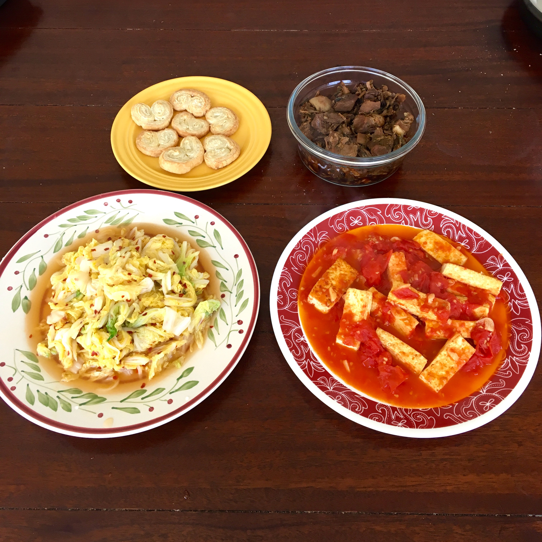 梅干菜烧肉,番茄豆腐,辣白菜,蝴蝶酥当小零食~