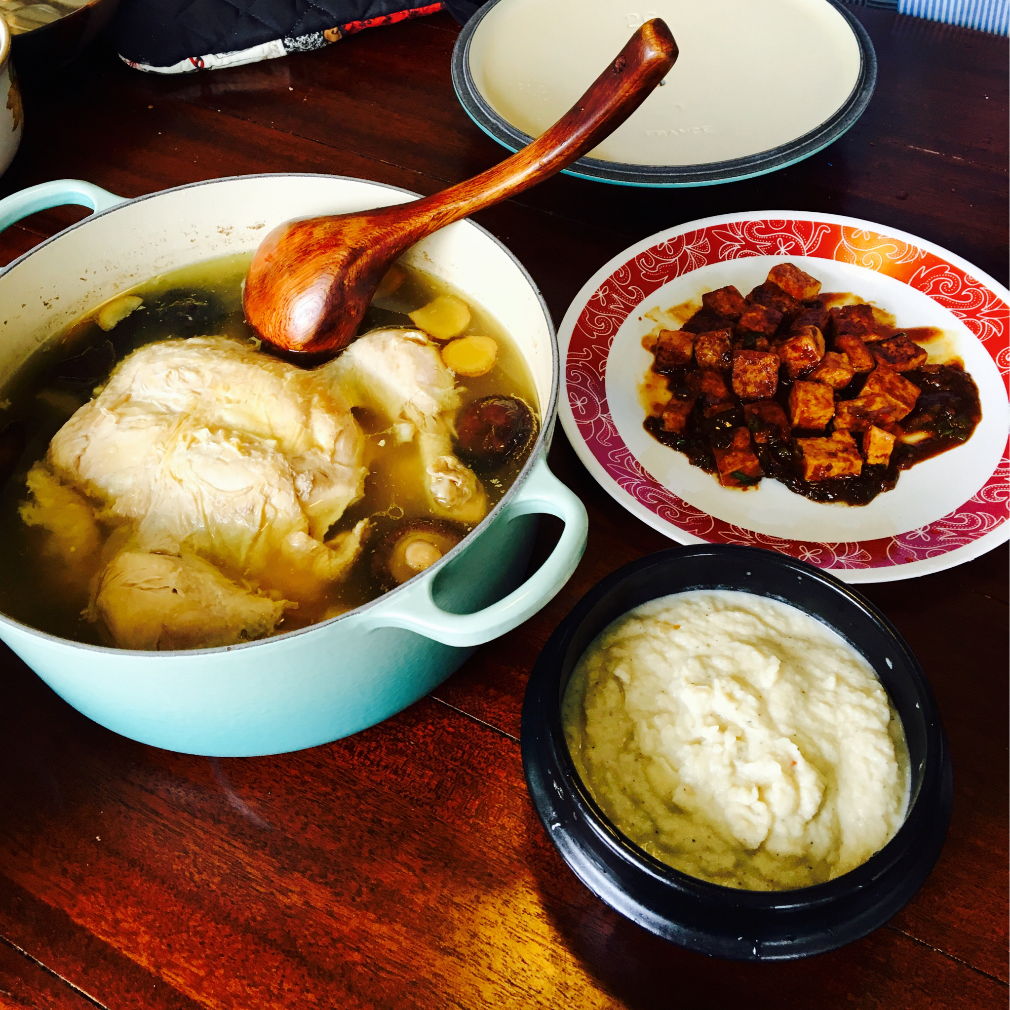 香菇鸡汤,豆瓣酱烧豆腐,花菜浓汤