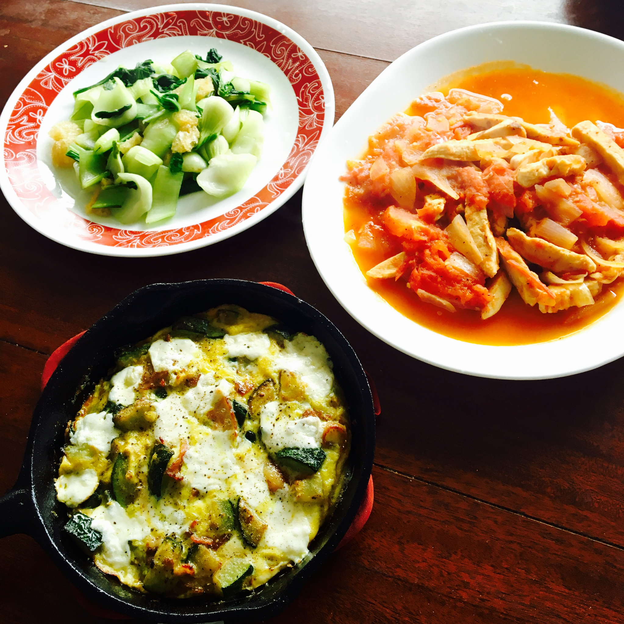 番茄鸡胸,西葫芦frittata,猪皮炒青菜