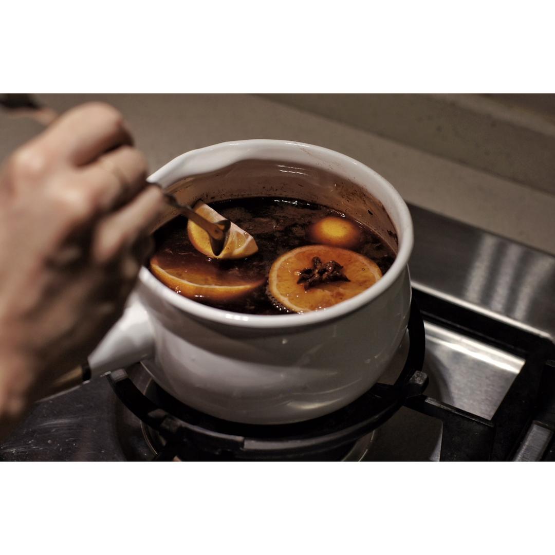 平安夜。回家煮了一锅热红酒,加了橙,柠檬,八角,肉桂棒,磨了些肉豆蔻,可惜没有丁香插满橙子的仪式感。#晚餐•2018年1...