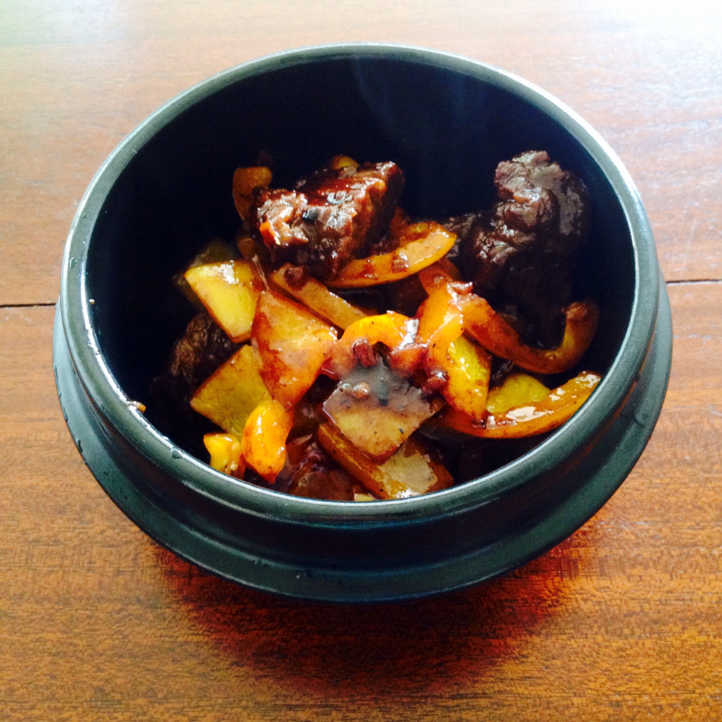 昨天的红烧牛肉剩了一些,加了彩椒炒,居然做出了小饭馆的味道!