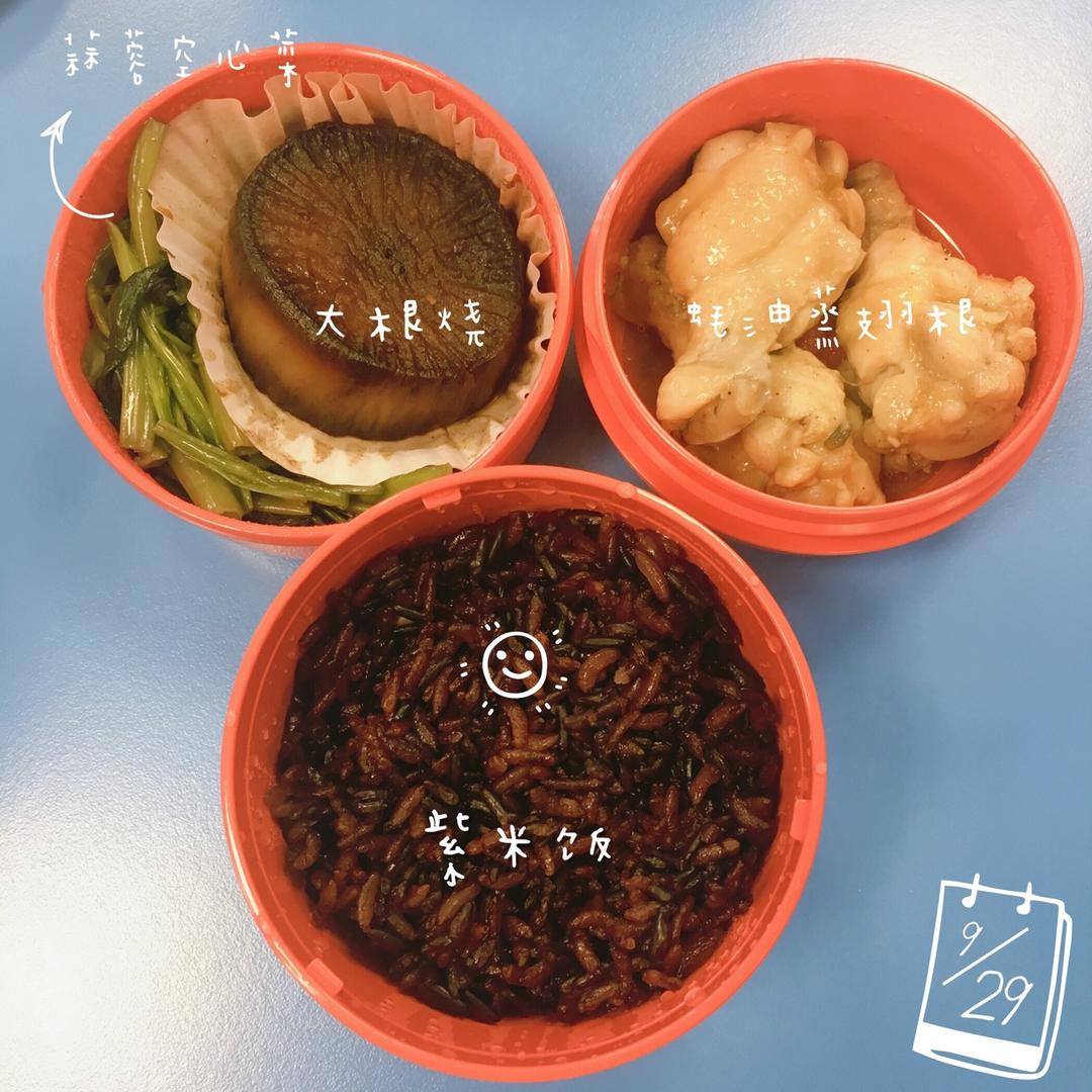 翅根:晚上腌好,早上冷水入锅,上汽后蒸10分钟关火闷5分钟。萝卜双休切断白水煮好冷冻昨晚冷藏解冻,早上刷酱油小锅煎热。炒...