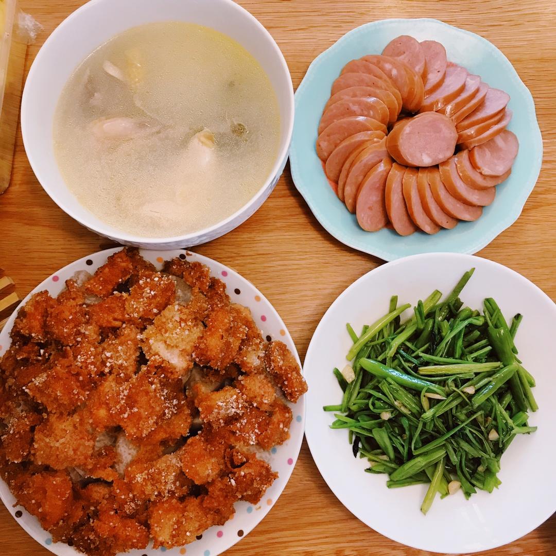 今日午饭:蒜蓉空心菜➕红肠➕芋头粉蒸肉➕山药鸡汤