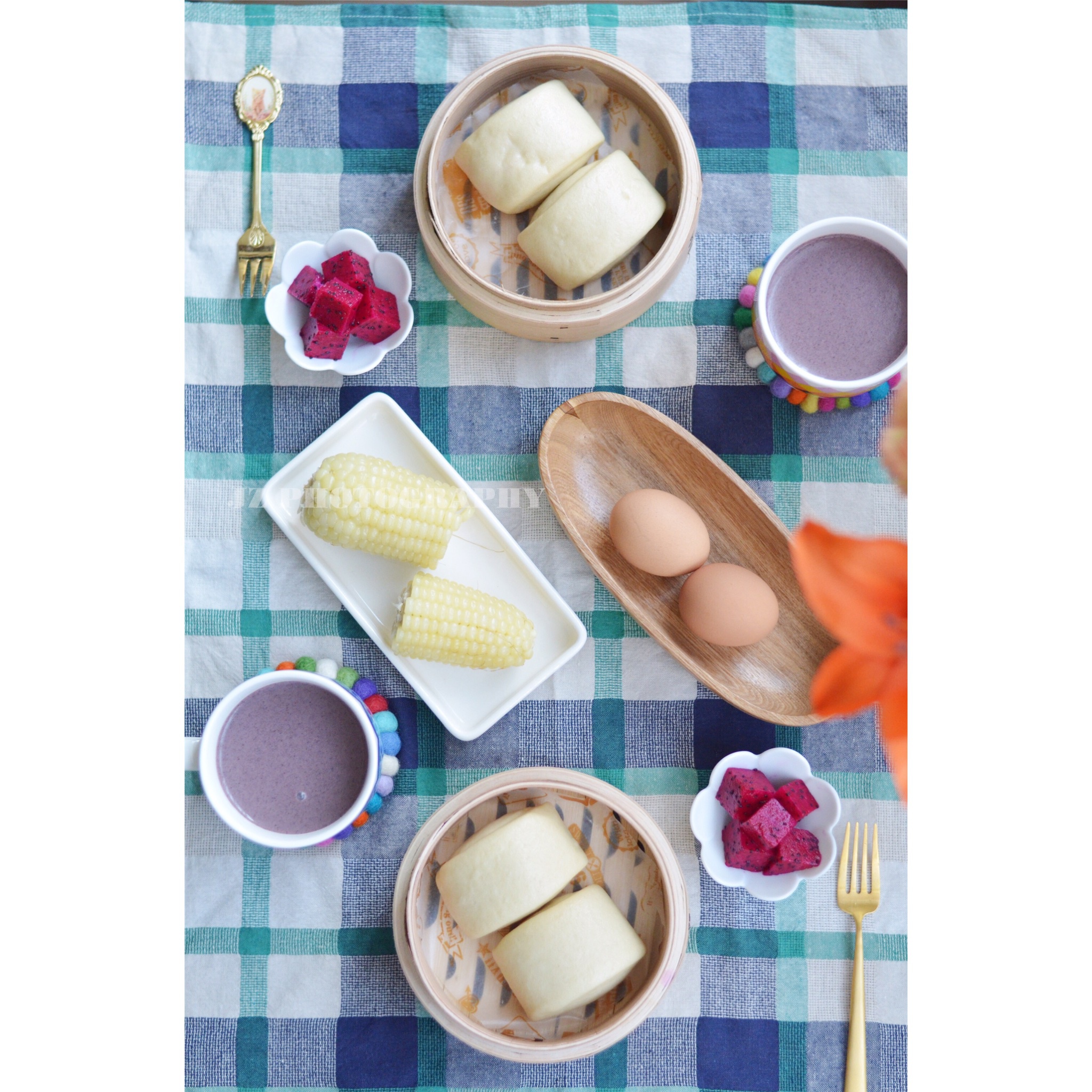 牛奶刀切,蒸玉米,煮鸡蛋,火龙果。