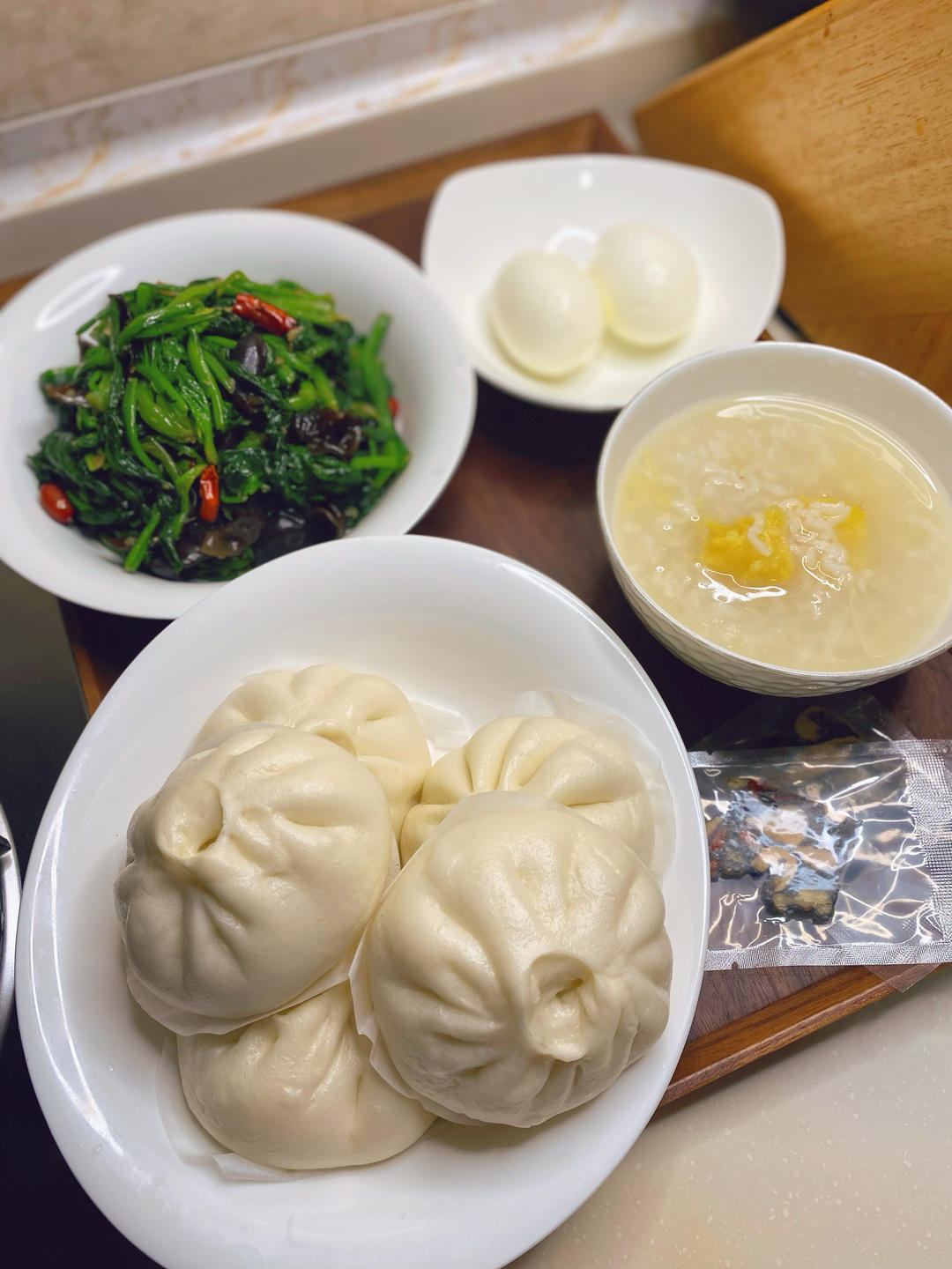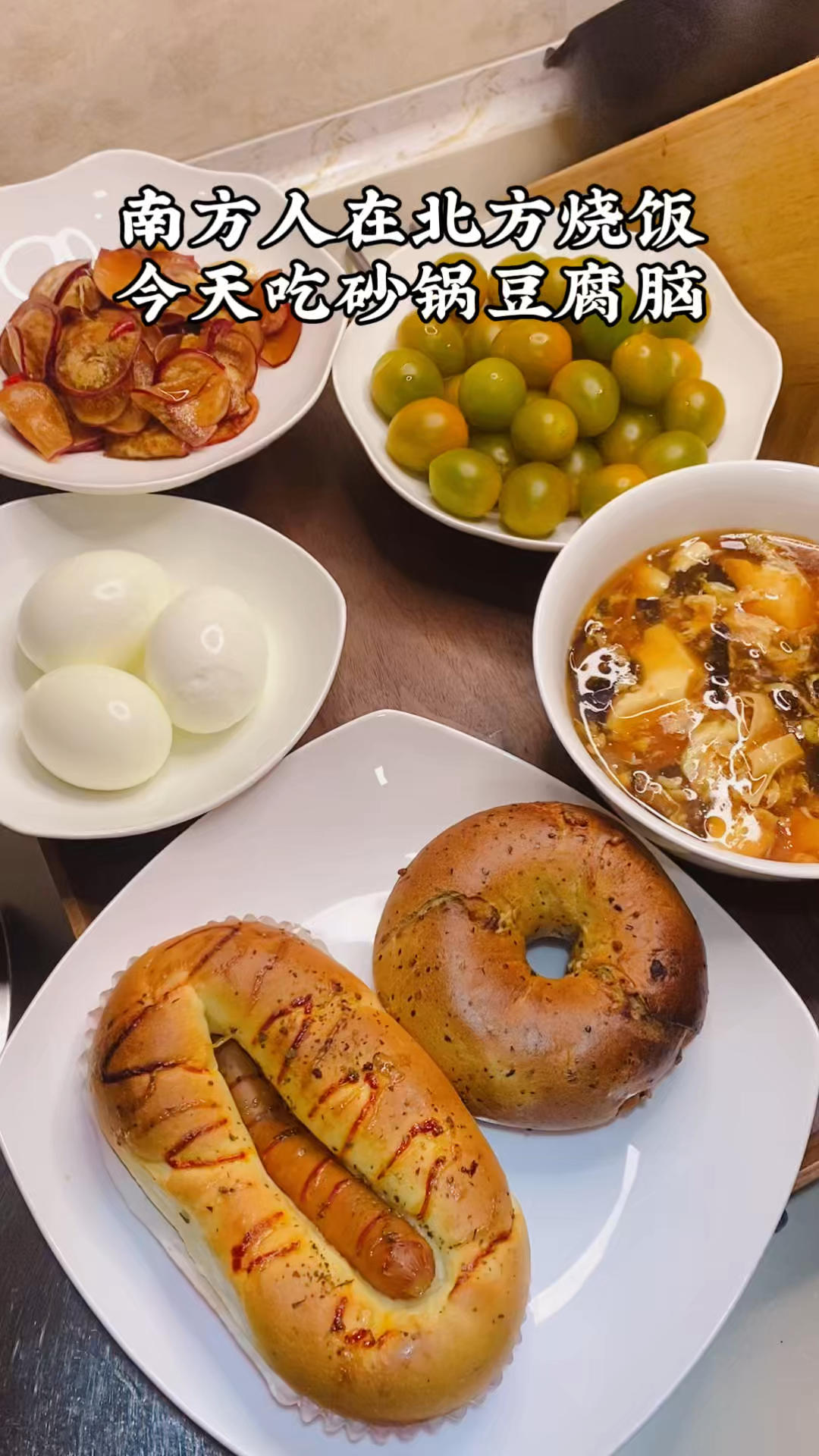 🎈早餐:贝果,肠仔包,鸡蛋,豆腐脑,腌樱桃萝卜,豆腐脑