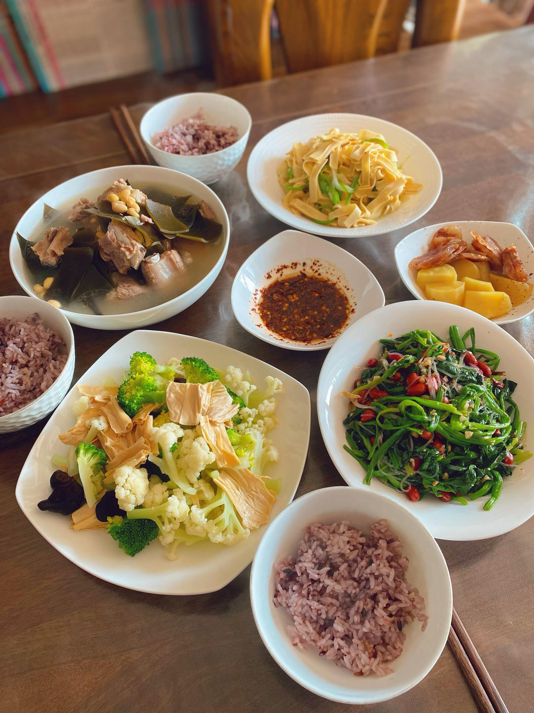 午餐:排骨海带黄豆汤,青椒干豆腐,白灼菜花,拌菠菜粉丝,主食杂粮米饭