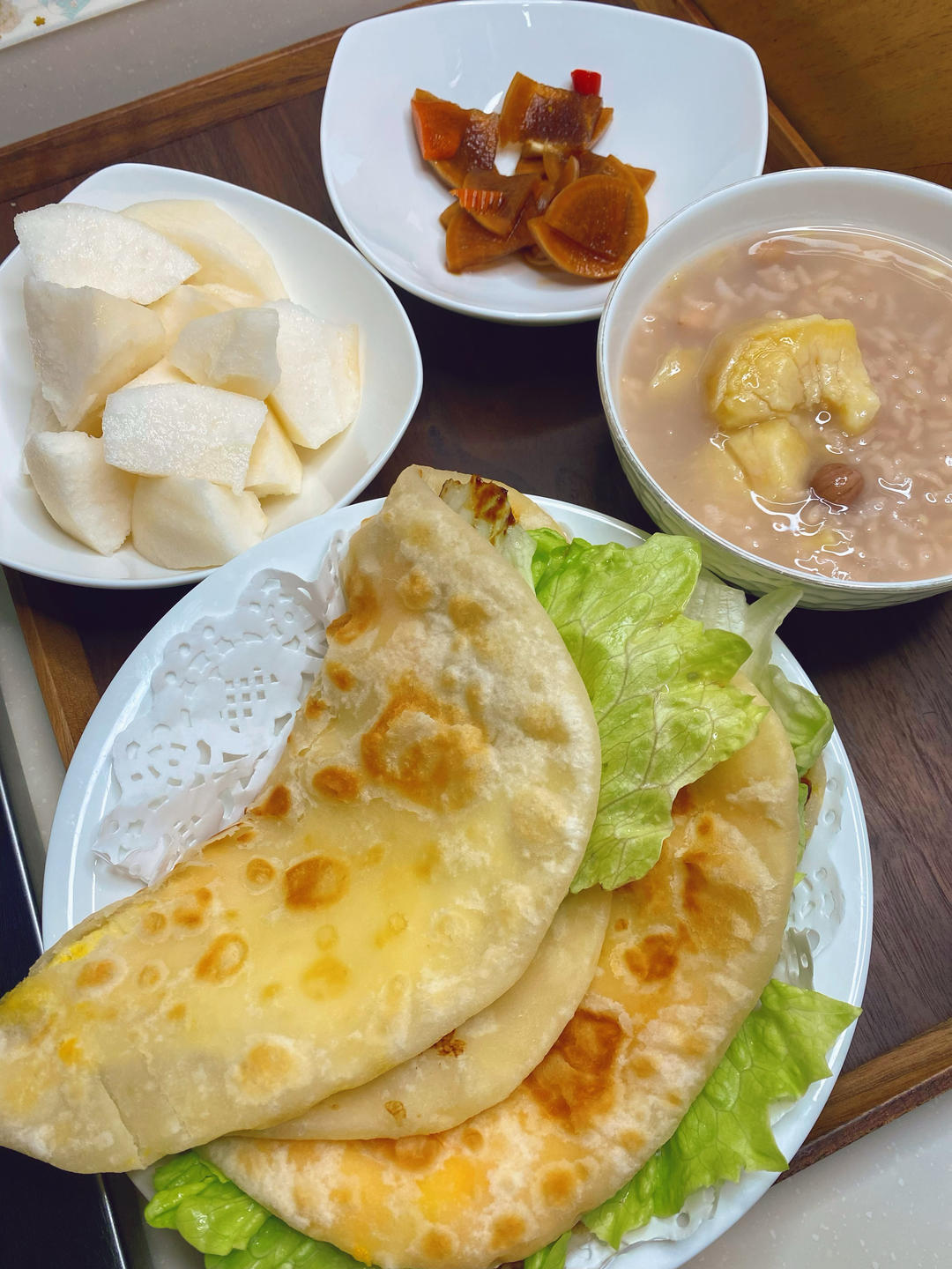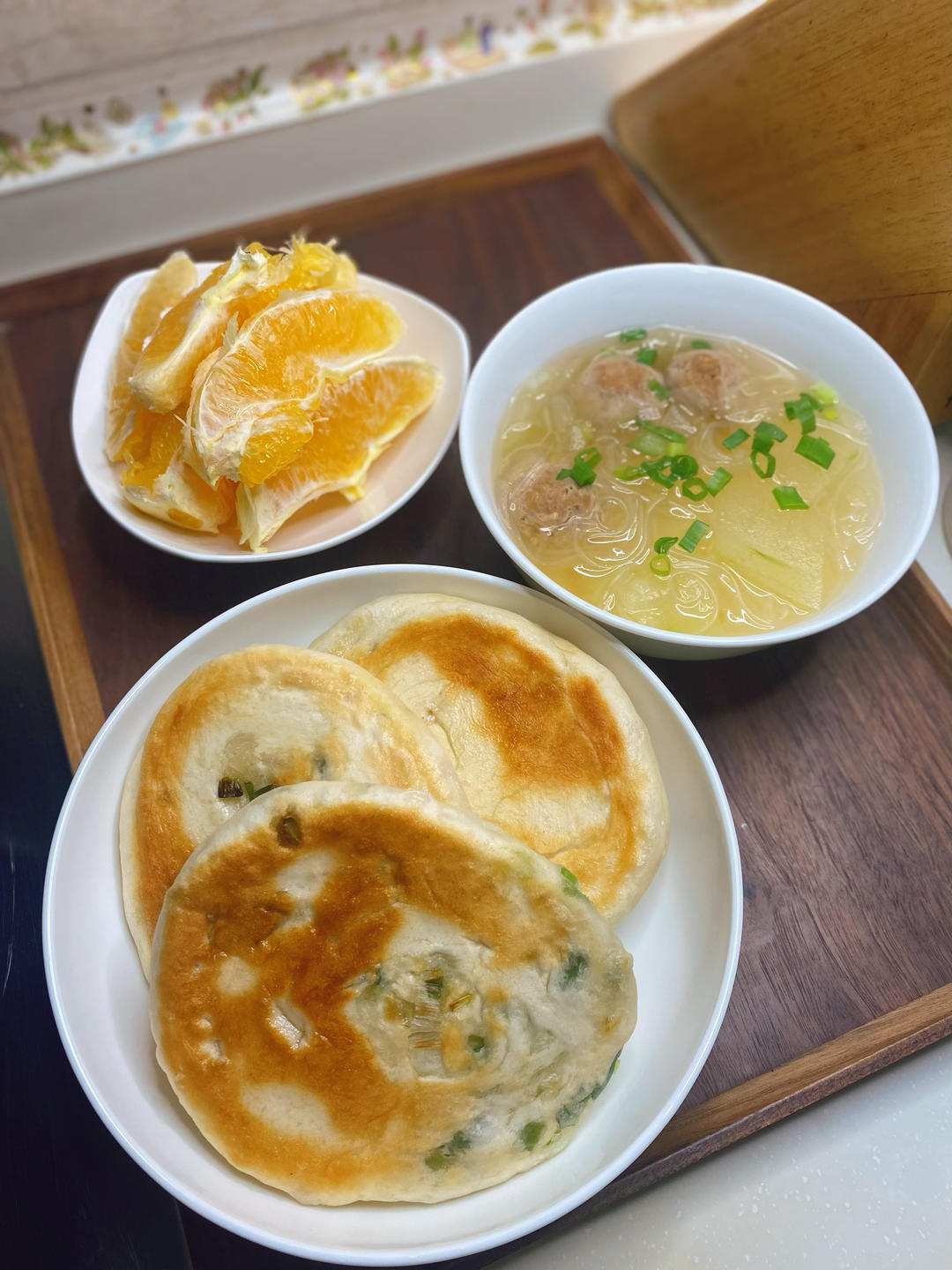 早餐:葱花发面饼,冬瓜丸子汤