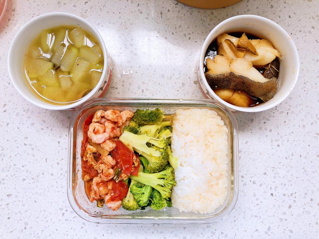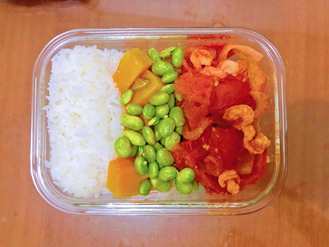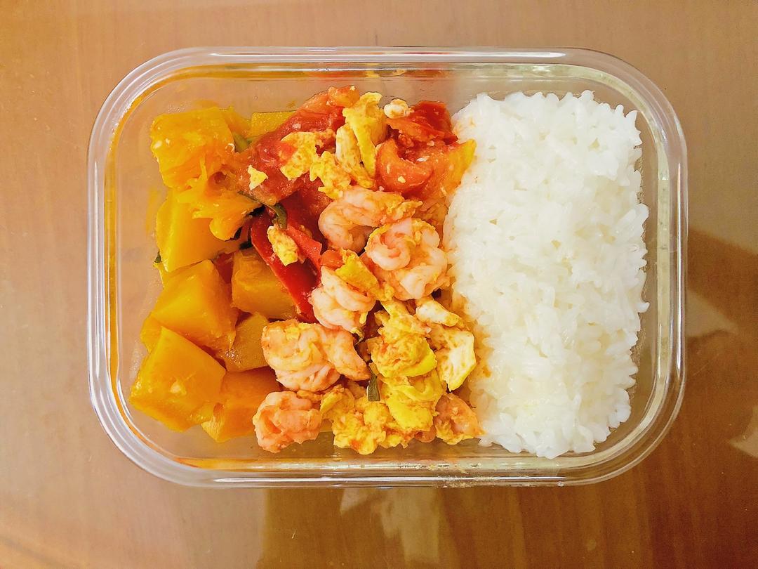 清炒南瓜,姜煮毛豆,西红柿炒虾仁,米饭。