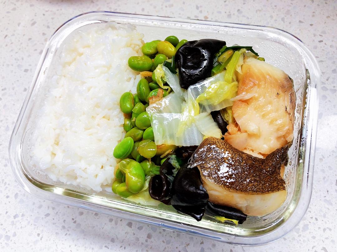 午安,妈妈的爱心便当:姜炒毛豆(煮烂的毛豆最好吃了。)清炒黑木耳 白菜。老酒半边鱼(...