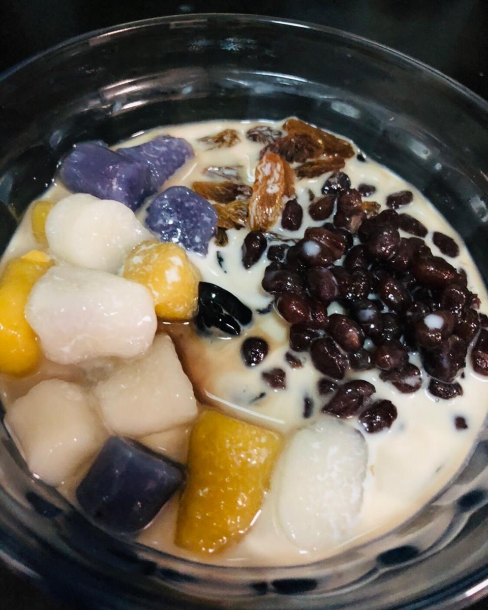 昨晚做了芋圆,紫薯芋圆,蜜红豆。今天奶奶生日宴做甜汤–四果汤,下午睡醒来一碗,好喜欢😋