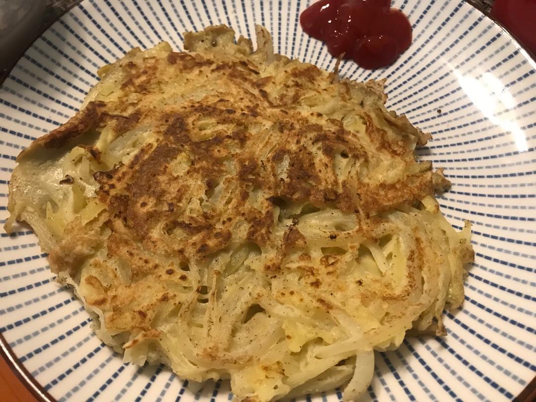 一个土豆+一个鸡蛋+1/5洋葱的土豆饼、豆渣鸡蛋饼、昨天切的面包下角料放在沙拉里刚刚好! #早餐•2018...