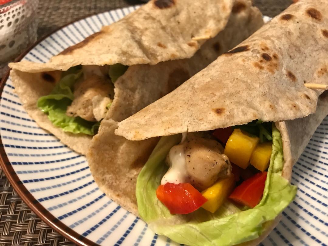 改良版墨西哥鸡肉卷、,昨天和铭哥做的,我擀皮,他烙饼,原版是炸鸡我改成煎了!五谷米糊,莎莎酱剩了半个西红柿...
