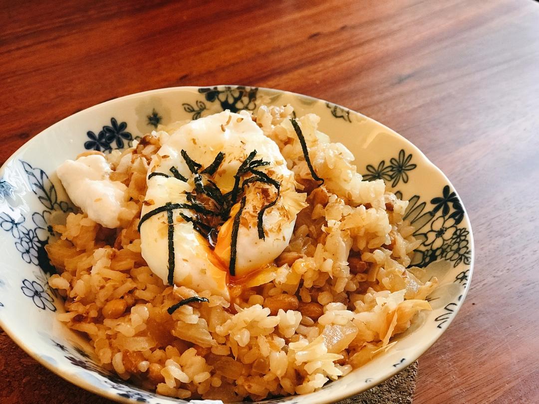 溏心蛋配纳豆炒糙米饭。锅热后倒入一点油和1/4个洋葱碎,炒变色后倒少量酱油,略炒一炒,倒入...