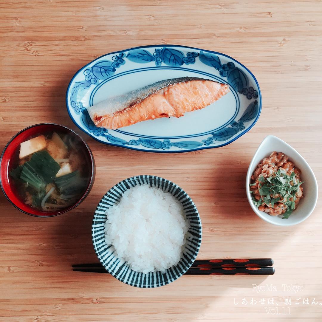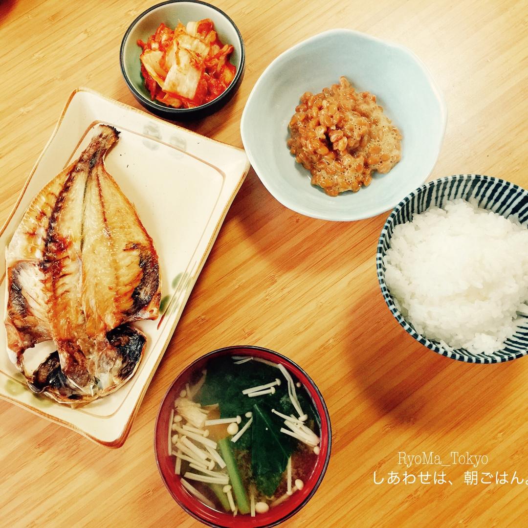 日式早饭,烤鱼,纳豆,酱汤。