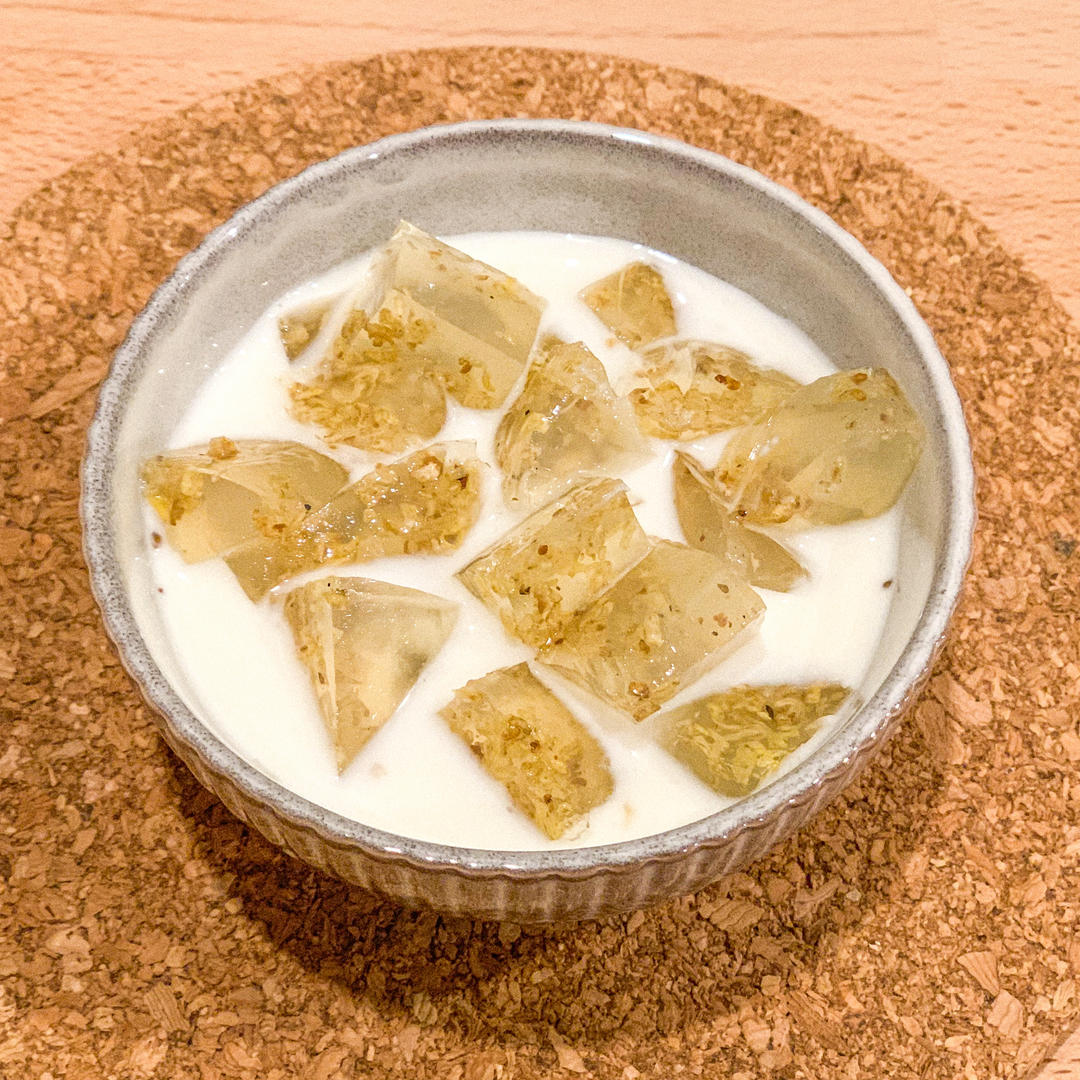 做桂花凍的時候沒有放糖,放了一點之前制的桂花蜜,吃的時候底下墊了酒釀,再澆點桂花蜜牛奶,味道剛剛好,很清爽🌿