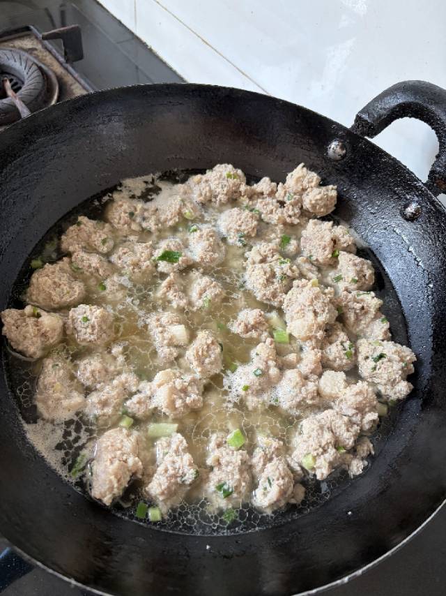 肥肉瘦肉一起搅碎,加了点盐,胡椒粉,红薯粉直接揉成丸子,小火煮到都浮起来,关火再泡5分钟。捞出冷冻
