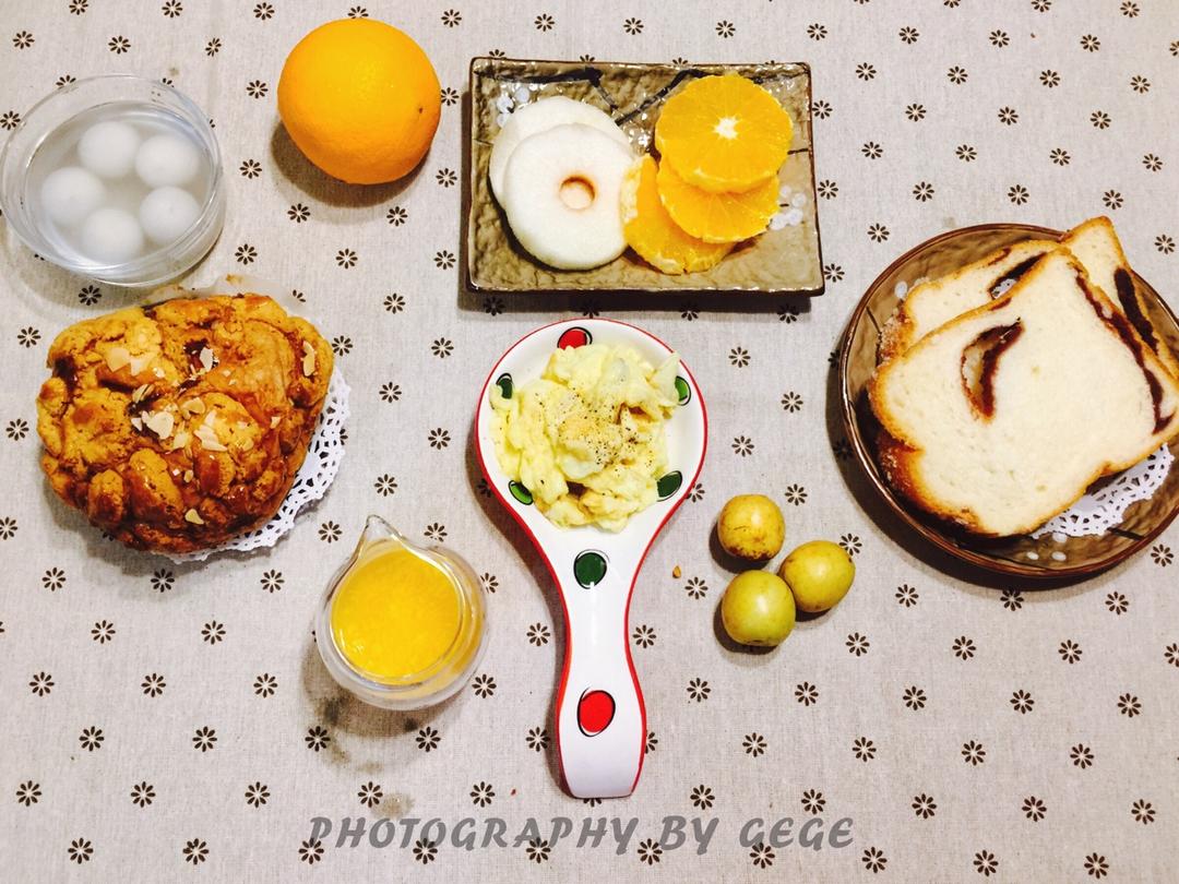 菠萝包&橙汁&法式蛋&红豆沙土司&芝麻汤团&水果盘 #早餐•2017...