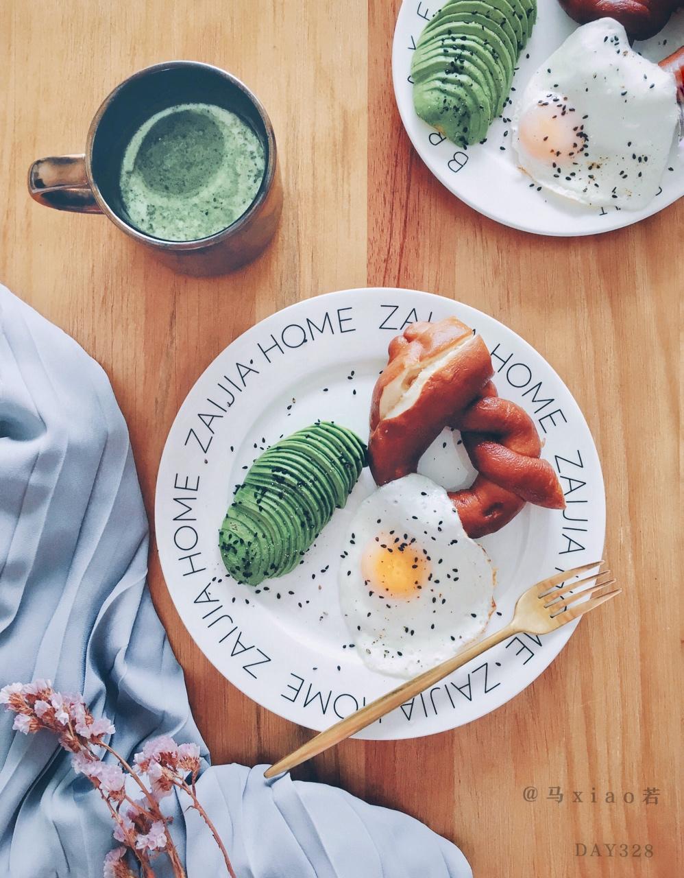【DAY328早餐】碱面包+牛油果+煎蛋+抹茶拿铁