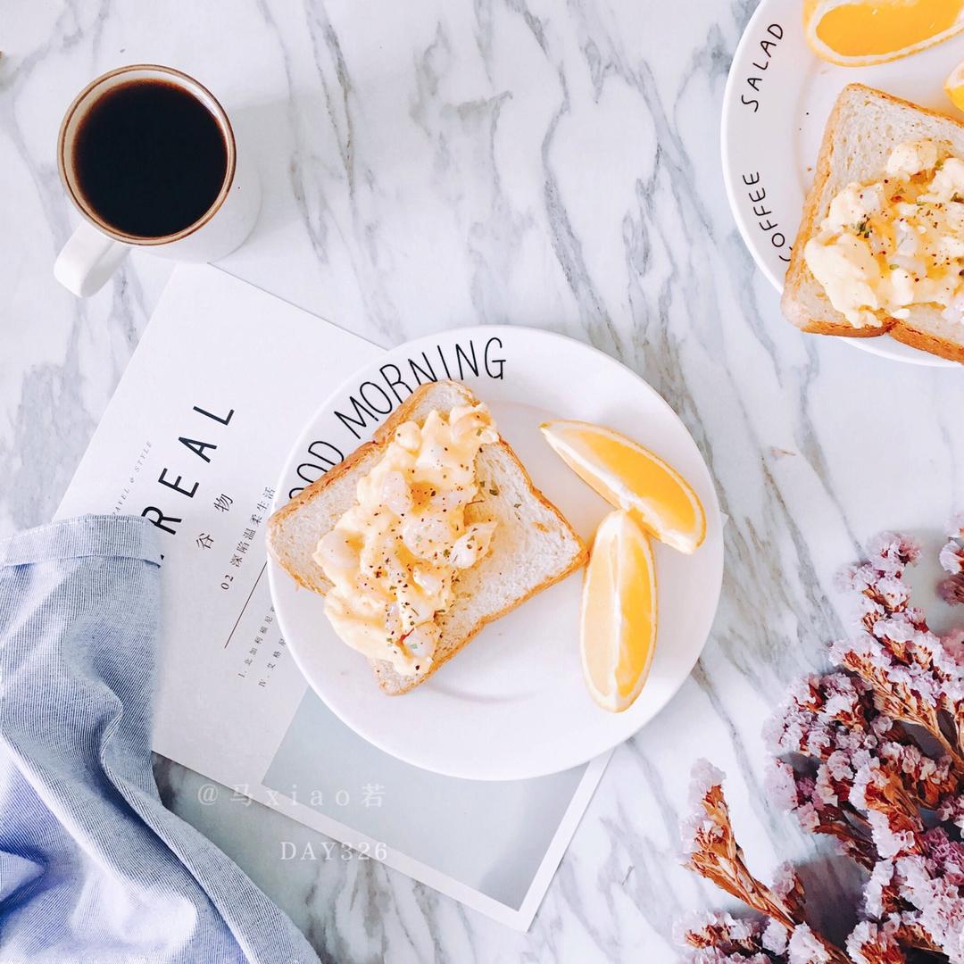 【DAY326早餐】虾仁滑蛋吐司+橙子+咖啡
