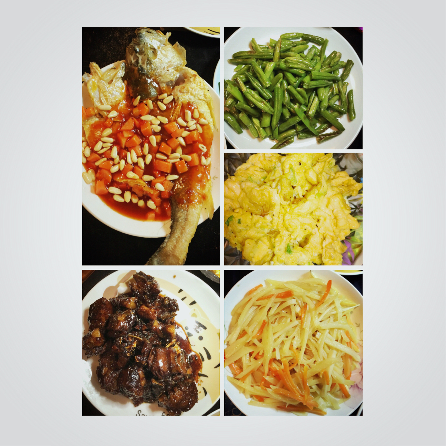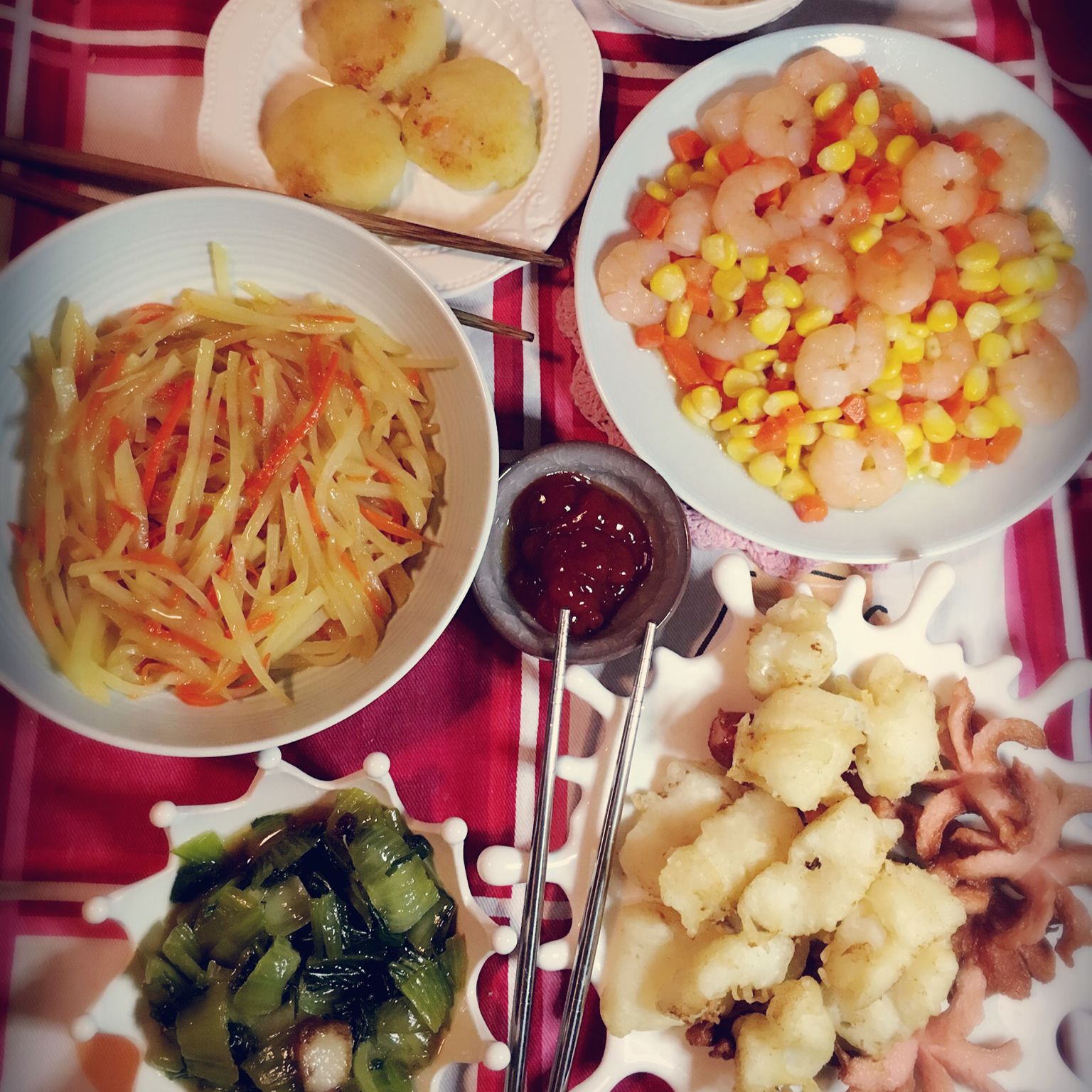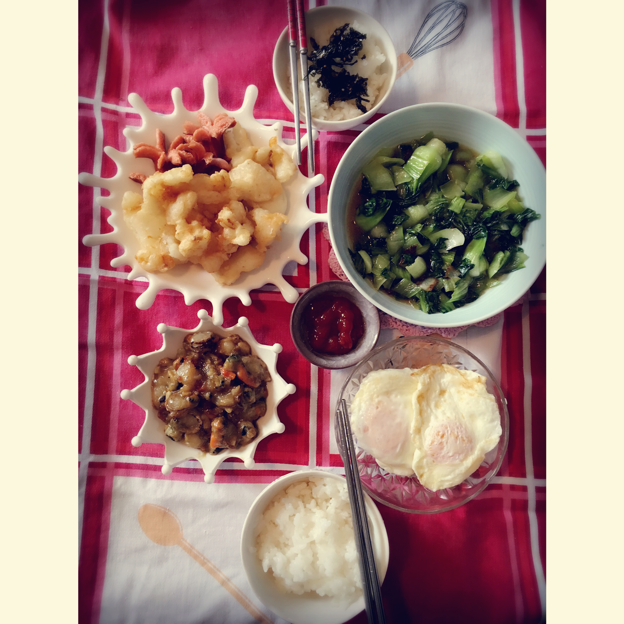 天妇罗鳕鱼 炸小香肠 腊肉炒青菜 蒜蓉扇贝肉 荷包蛋