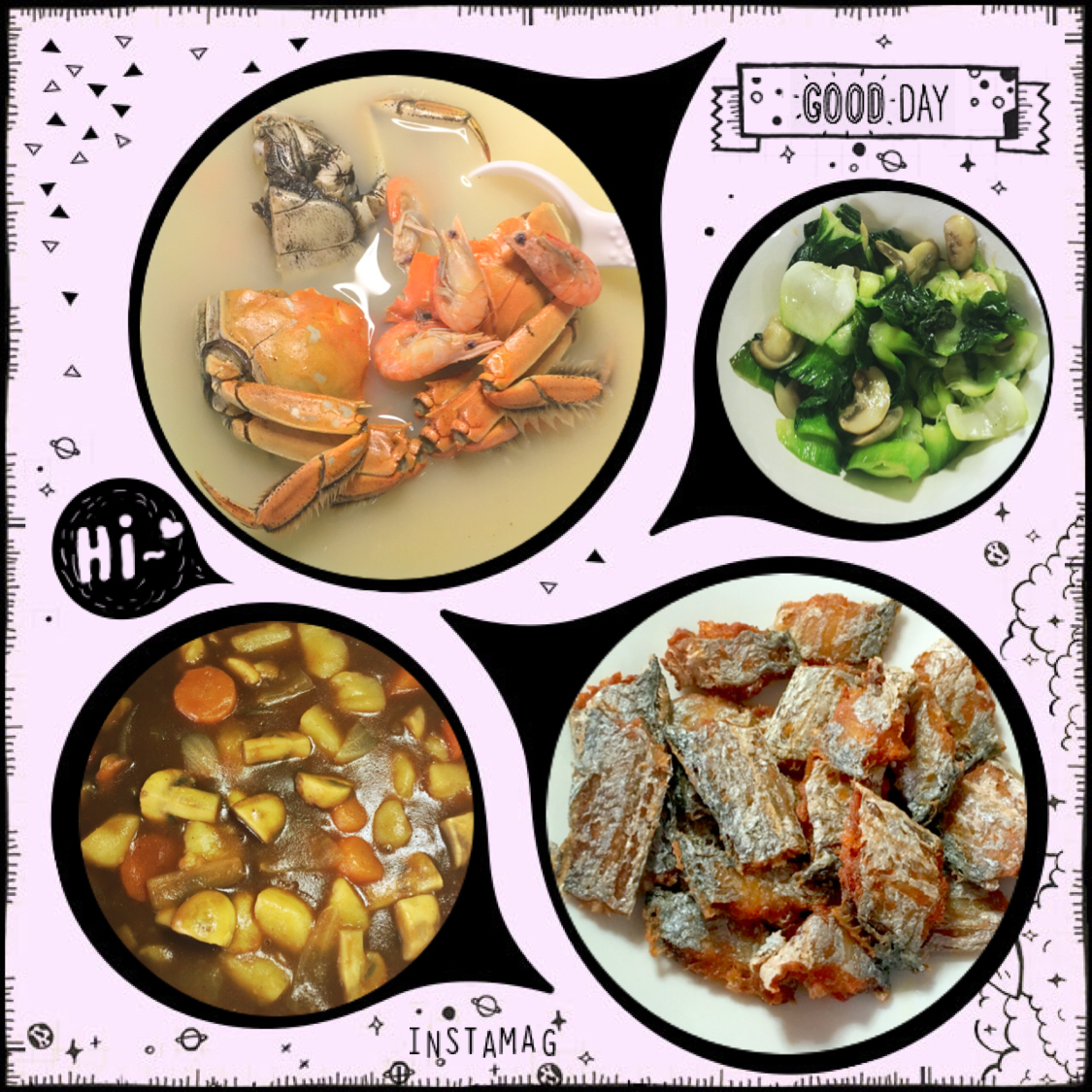 虾兵蟹将、干煎带鱼、蘑菇炒青菜、素咖喱拌饭吃