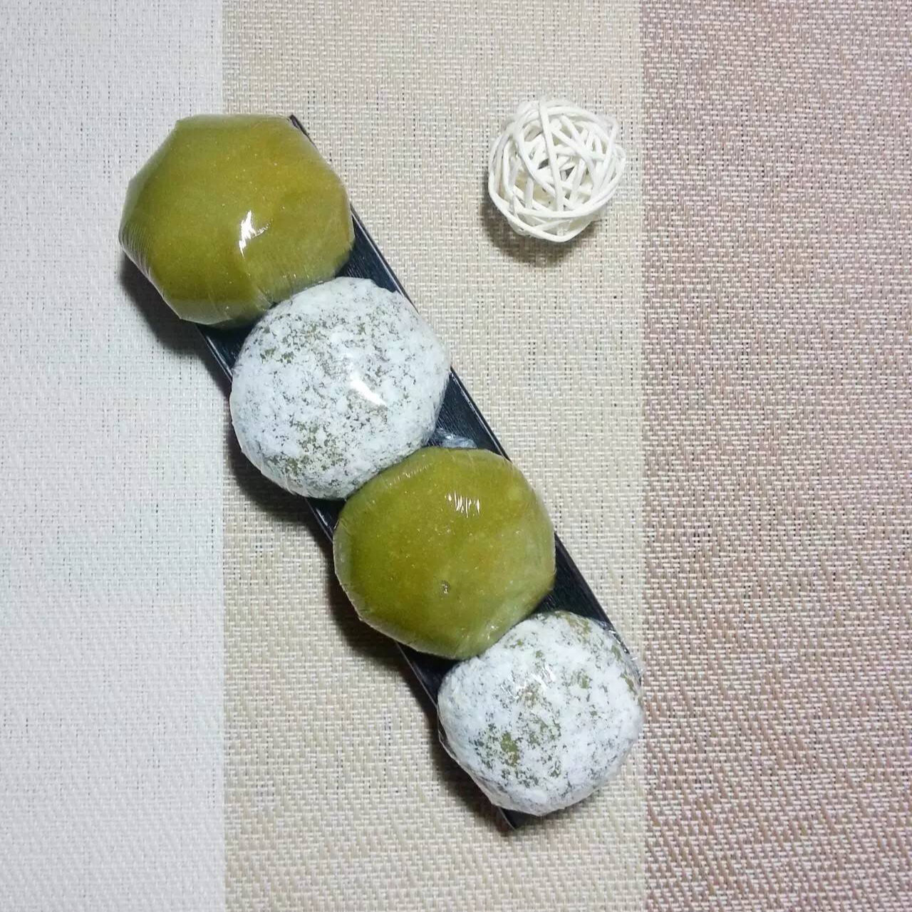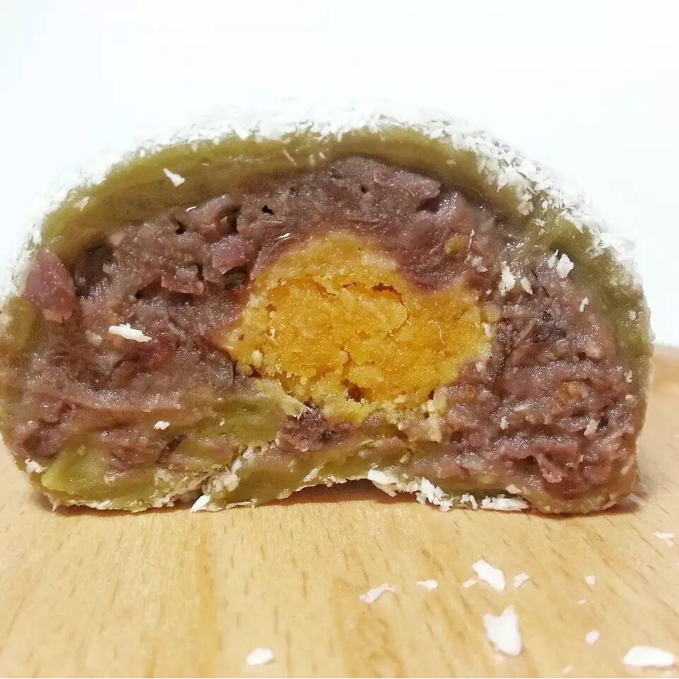 用的是抹茶粉,为了区分裹了层椰蓉的是红豆红枣馅哒,另一种是肉松咸蛋黄馅,都好吃!