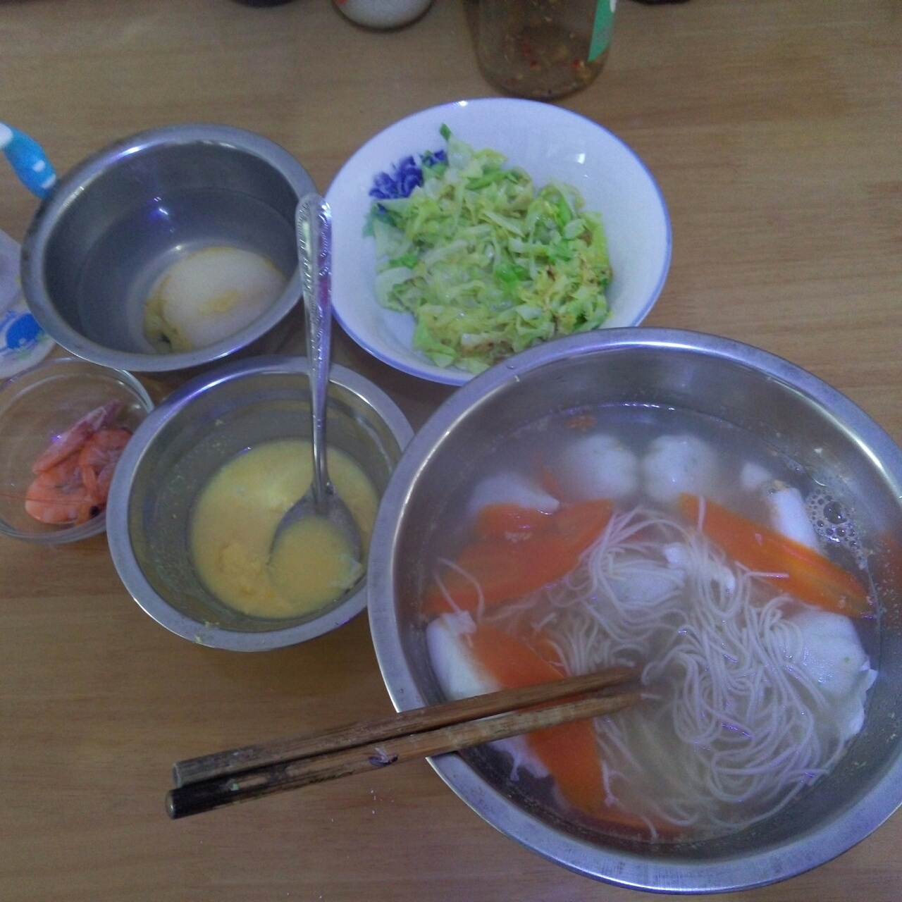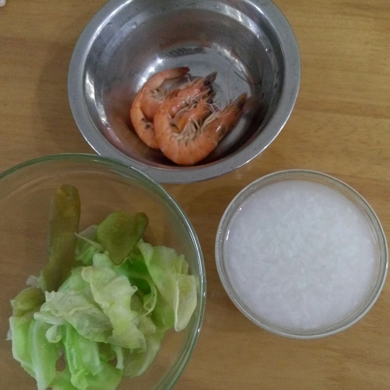 晚餐:稀饭,水煮包菜片,基围虾...
