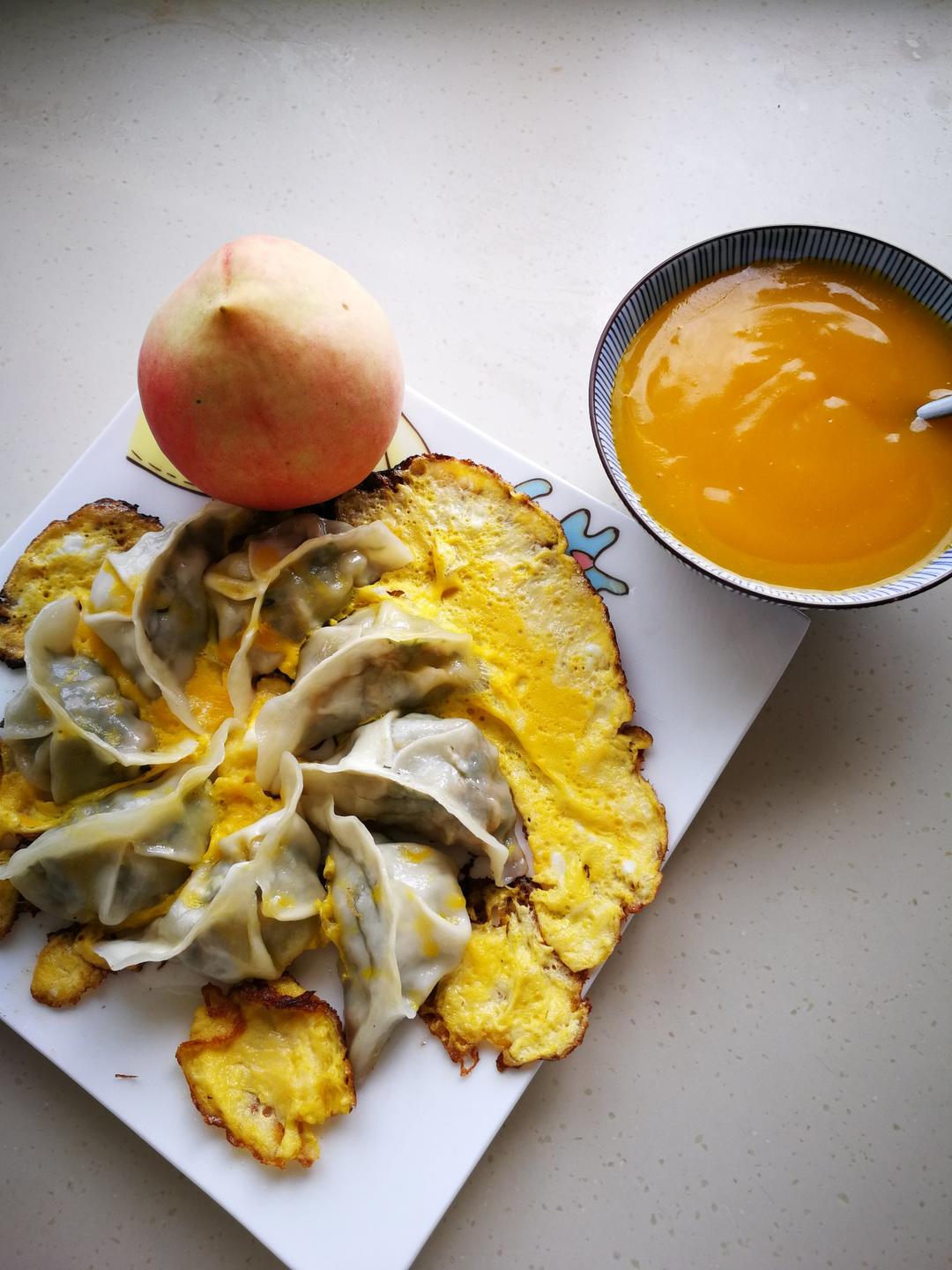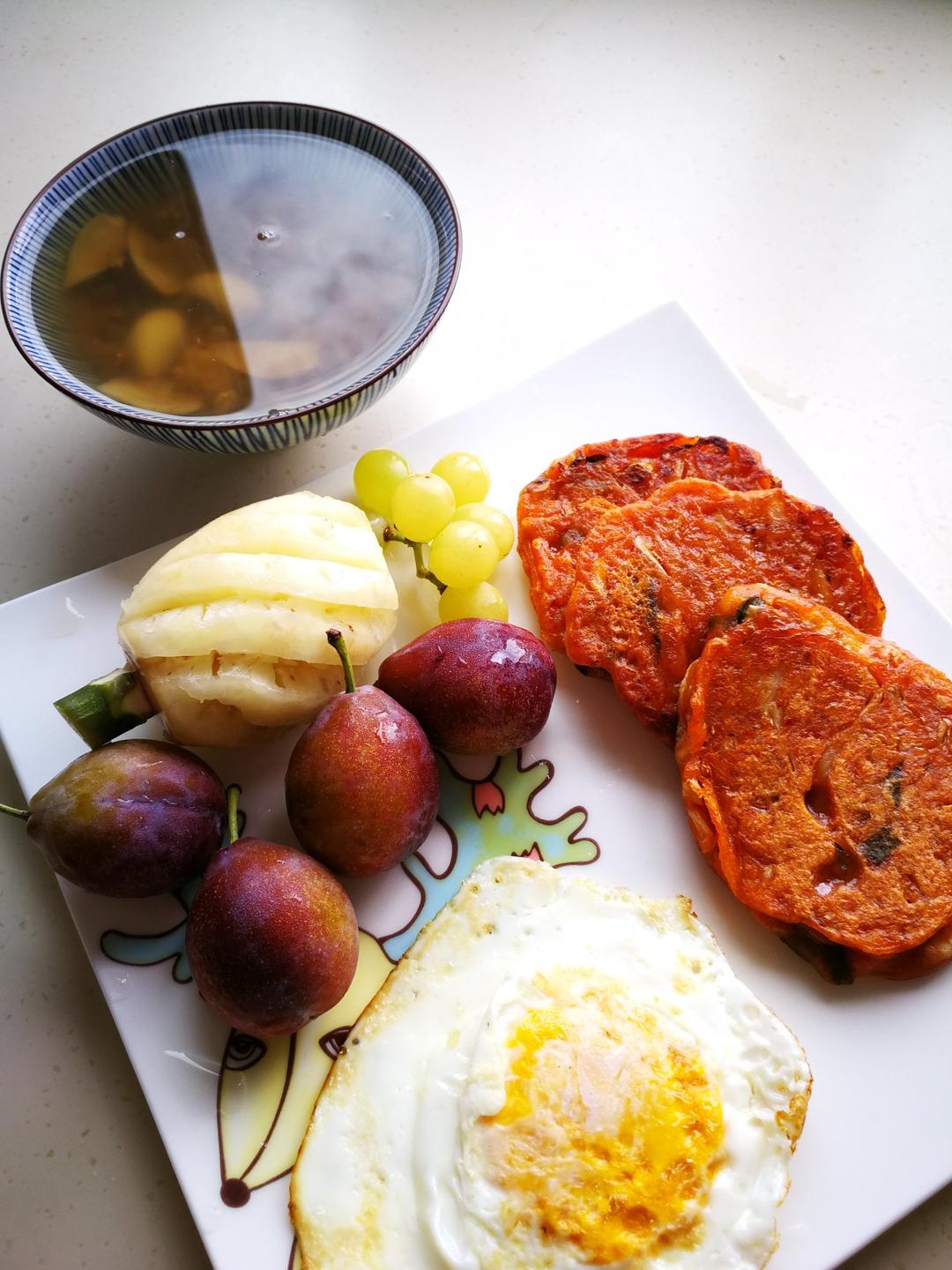泡菜饼,煎蛋,水果,绿豆百合汤