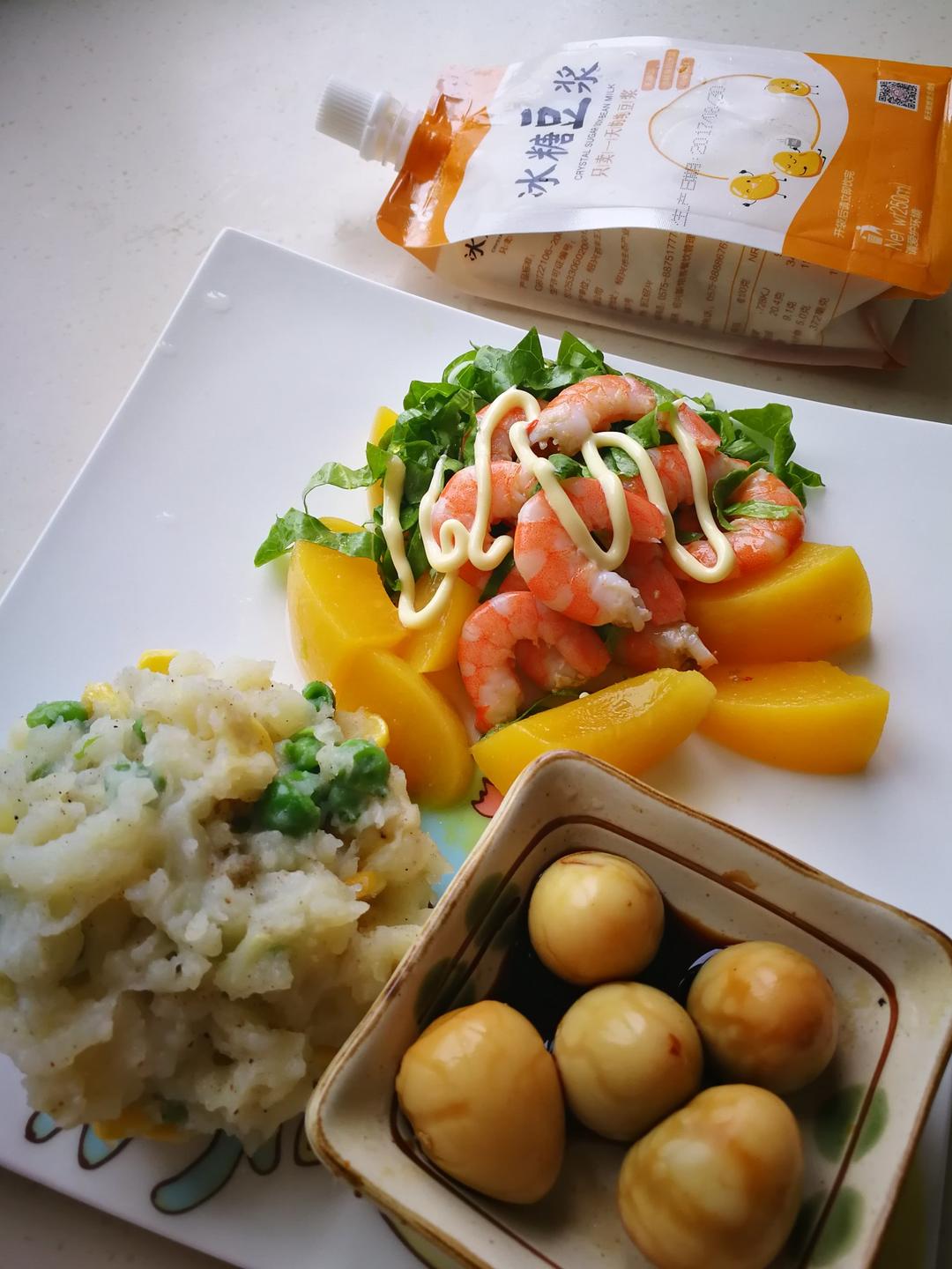 黄桃虾仁沙拉,土豆泥,五香鹌鹑蛋