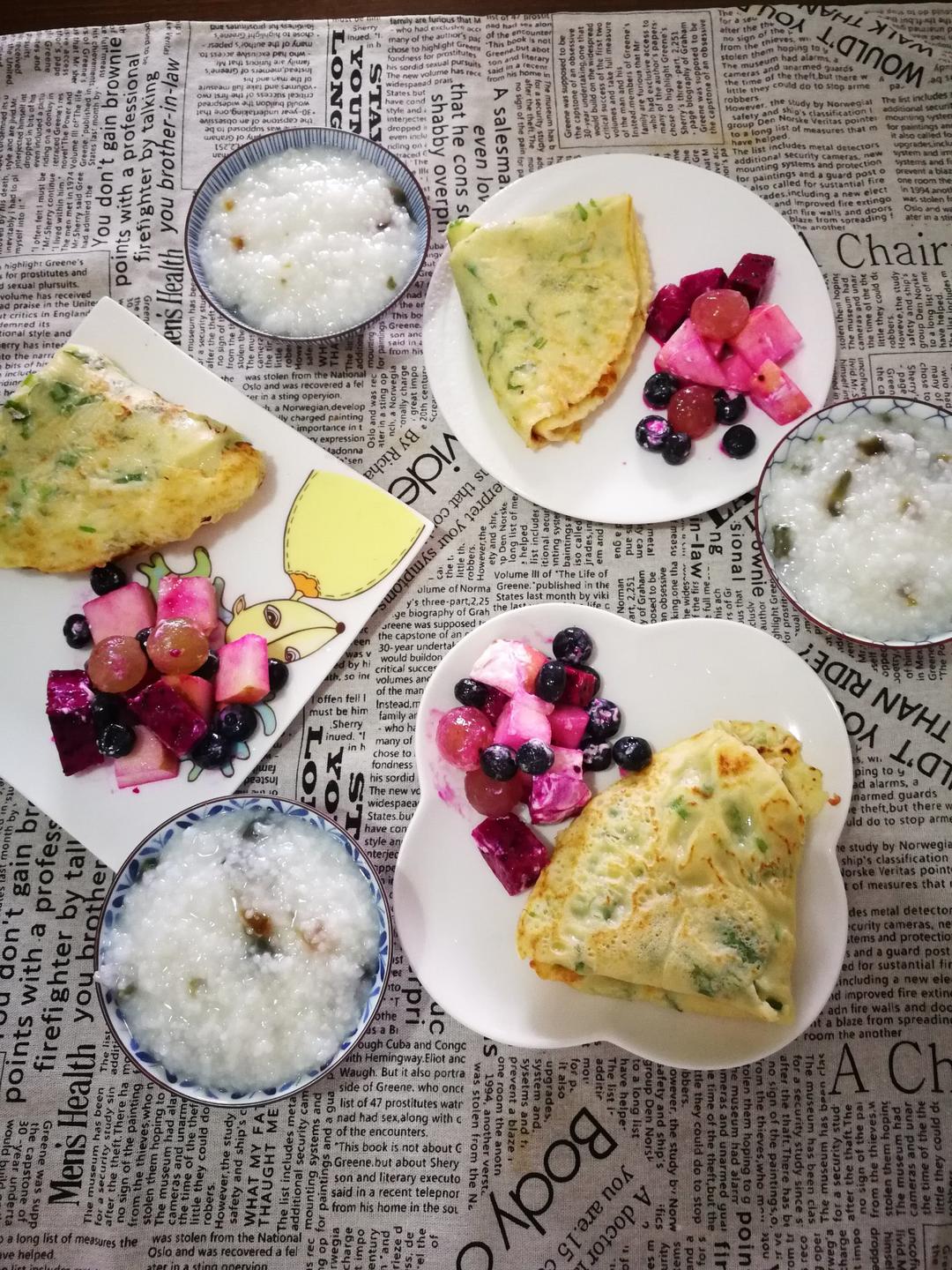 香菜鸡蛋饼,水果,皮蛋粥
