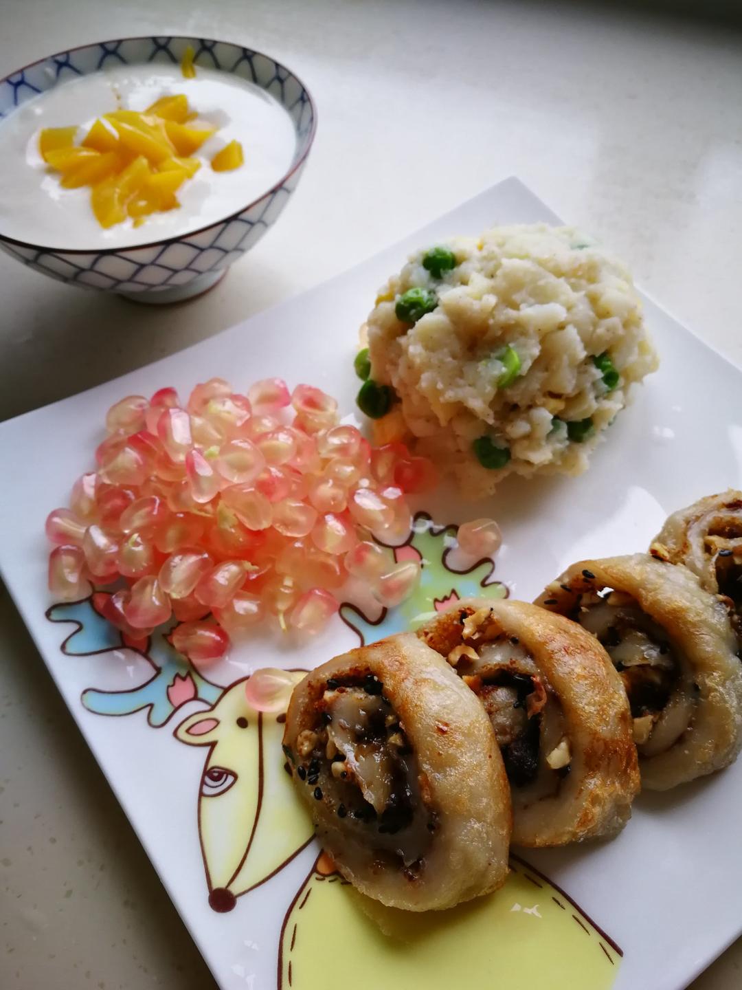 红糖麻滋,土豆泥,石榴,黄桃酸奶