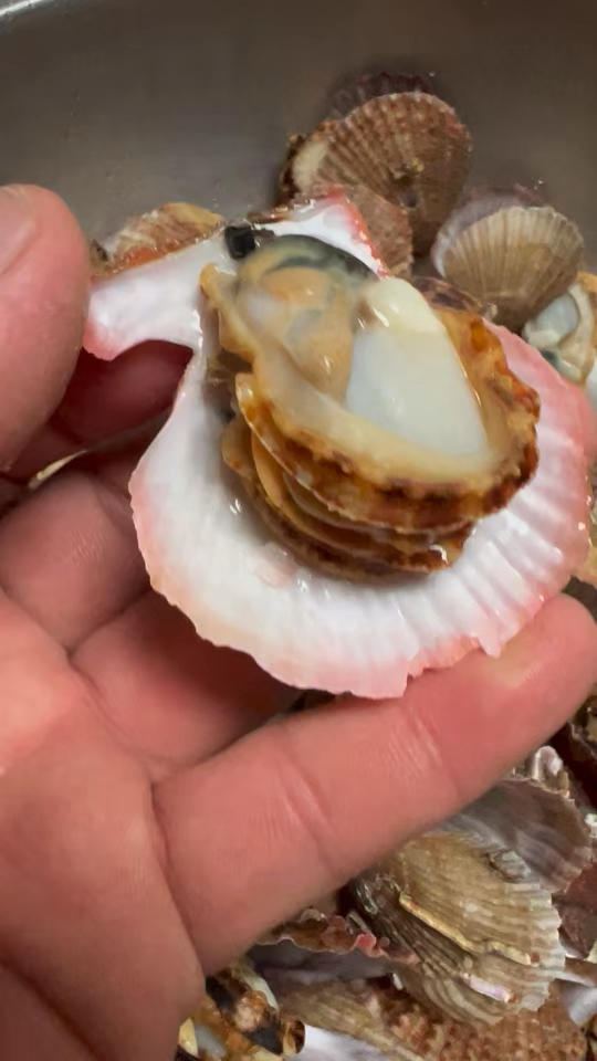 趁超市打折抢购🇯🇵野生扇贝,要去腮去墨绿色的肠哦,清洗花相当长时间,当然熟手就好