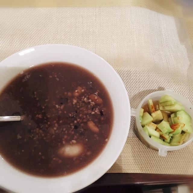 辣炒木耳,大米稀饭。黑白配