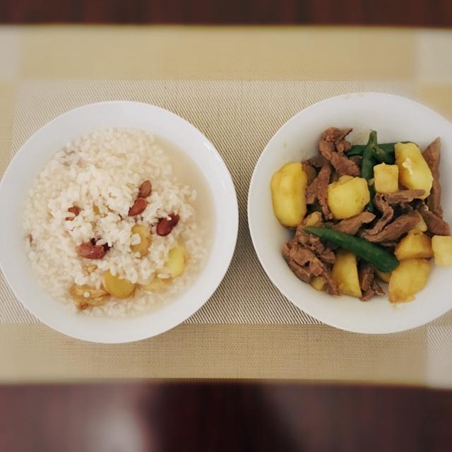 叫风吹的头痛,煮了姜汤不太管用,就熬了姜片大米粥,配小辣椒牛柳炖土豆,争取发发汗。