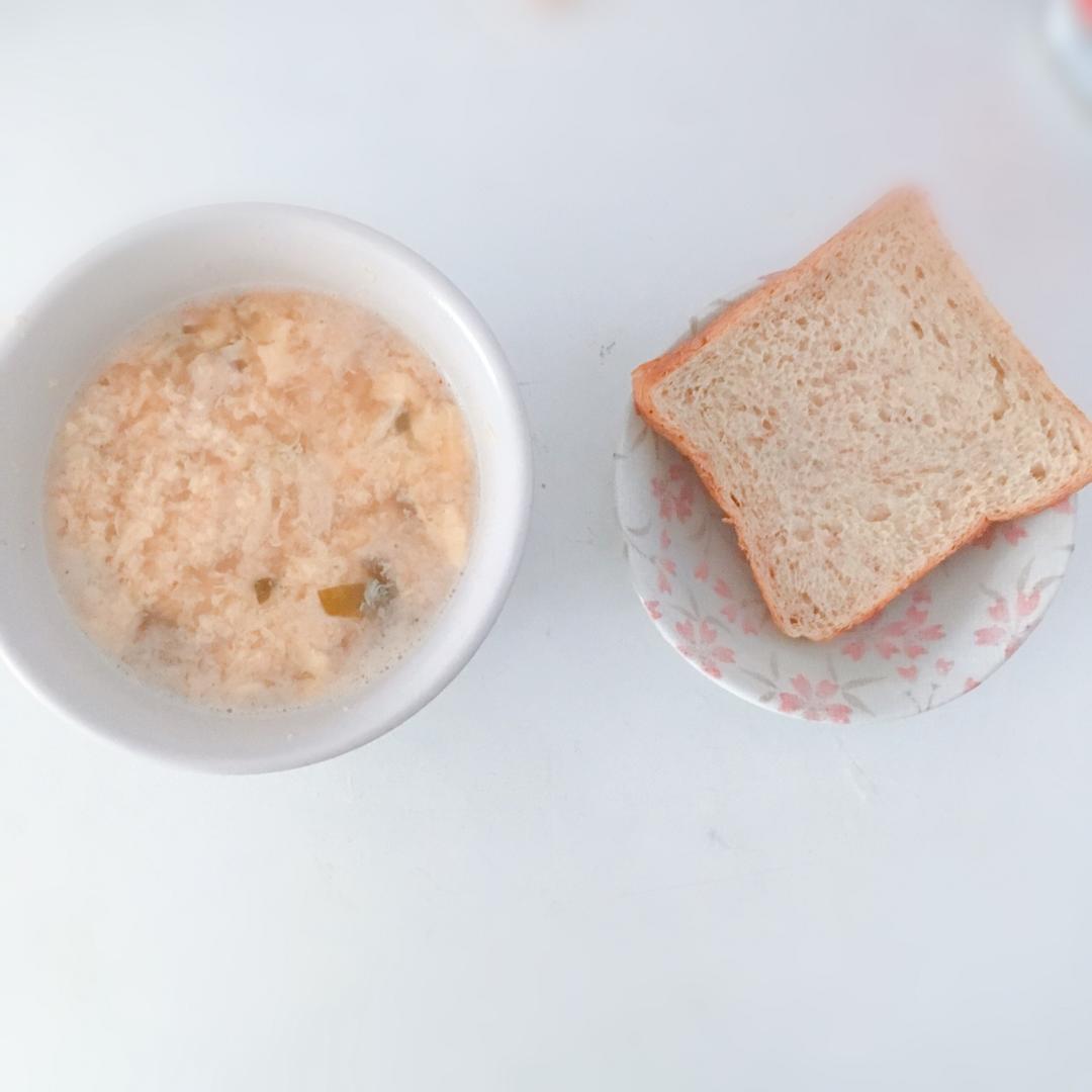早餐一碗鸡蛋豆腐大酱汤,一片面包。