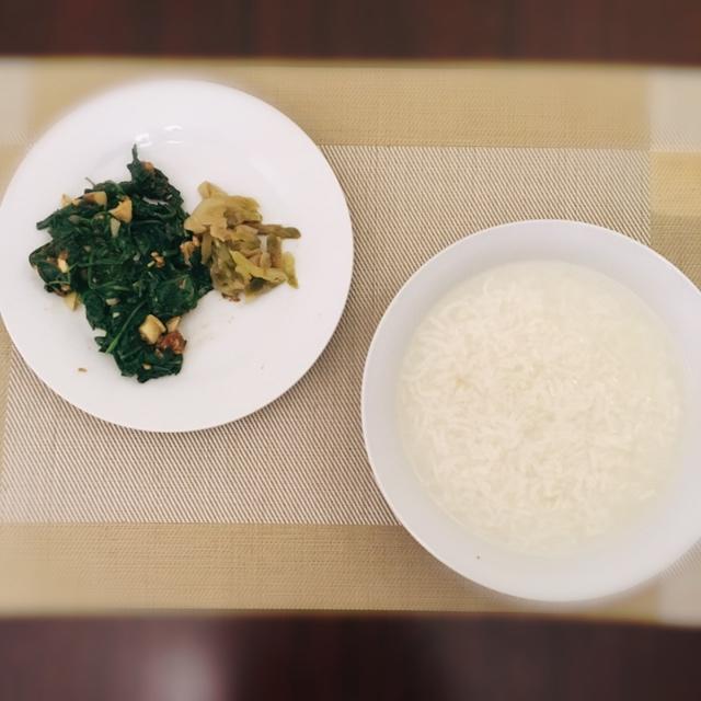 剩米饭熬了个粥,炒了个黄油蒜香的小菜,配点淡榨菜。